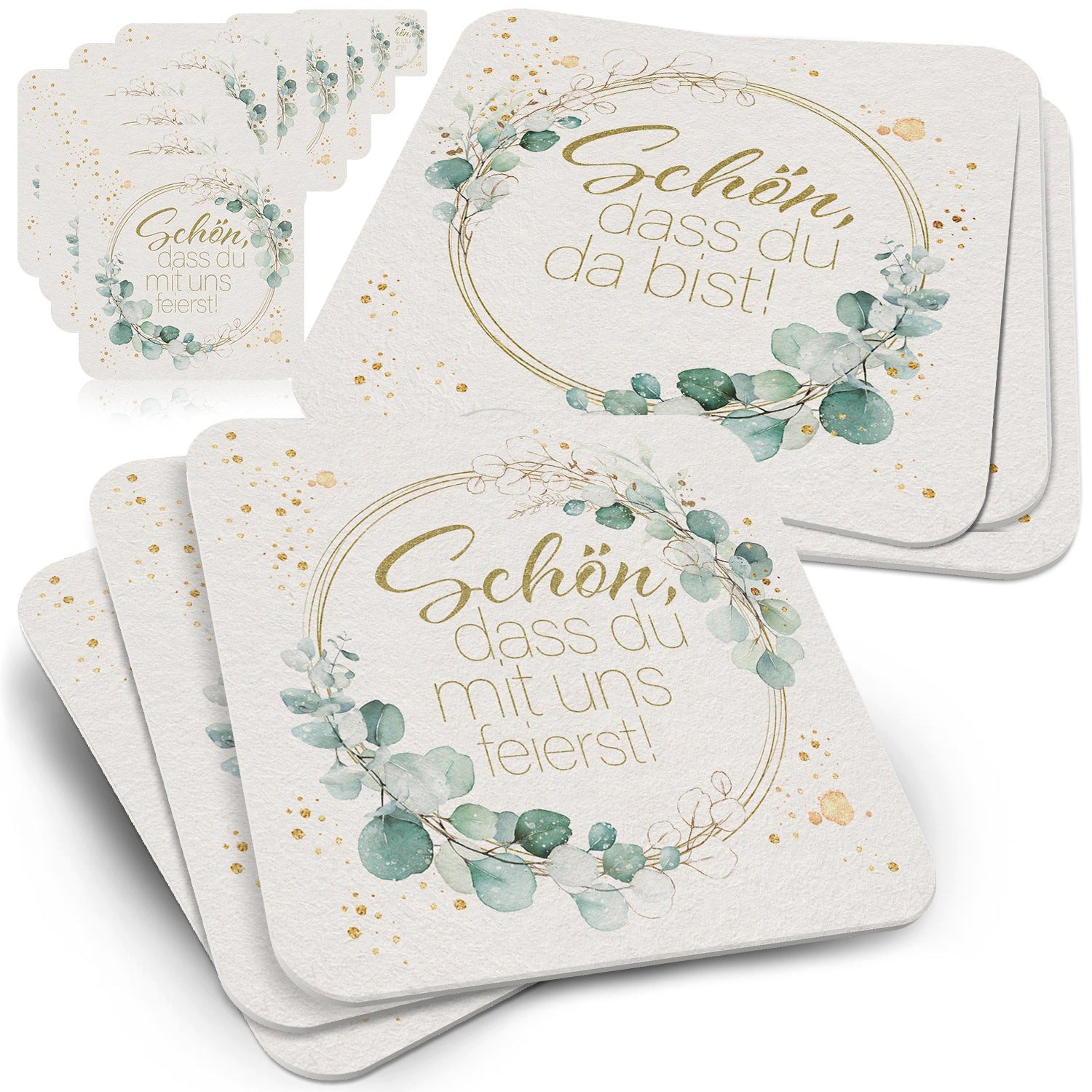 Motiv: Eukalyptus Floral - Schön, dass du da bist! und Schön, dass du mit uns feierst - beidseitg bedruckte Bierdeckel. Ideal für Hochzeiten, Geburtstage, Jubiläen oder jede Ve...