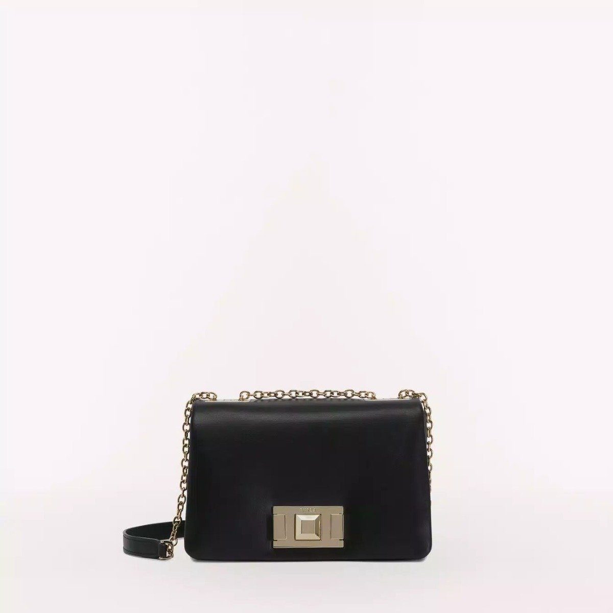 Überschlagtasche in schwarz aus leder von der marke furla. Ein steckfach innen