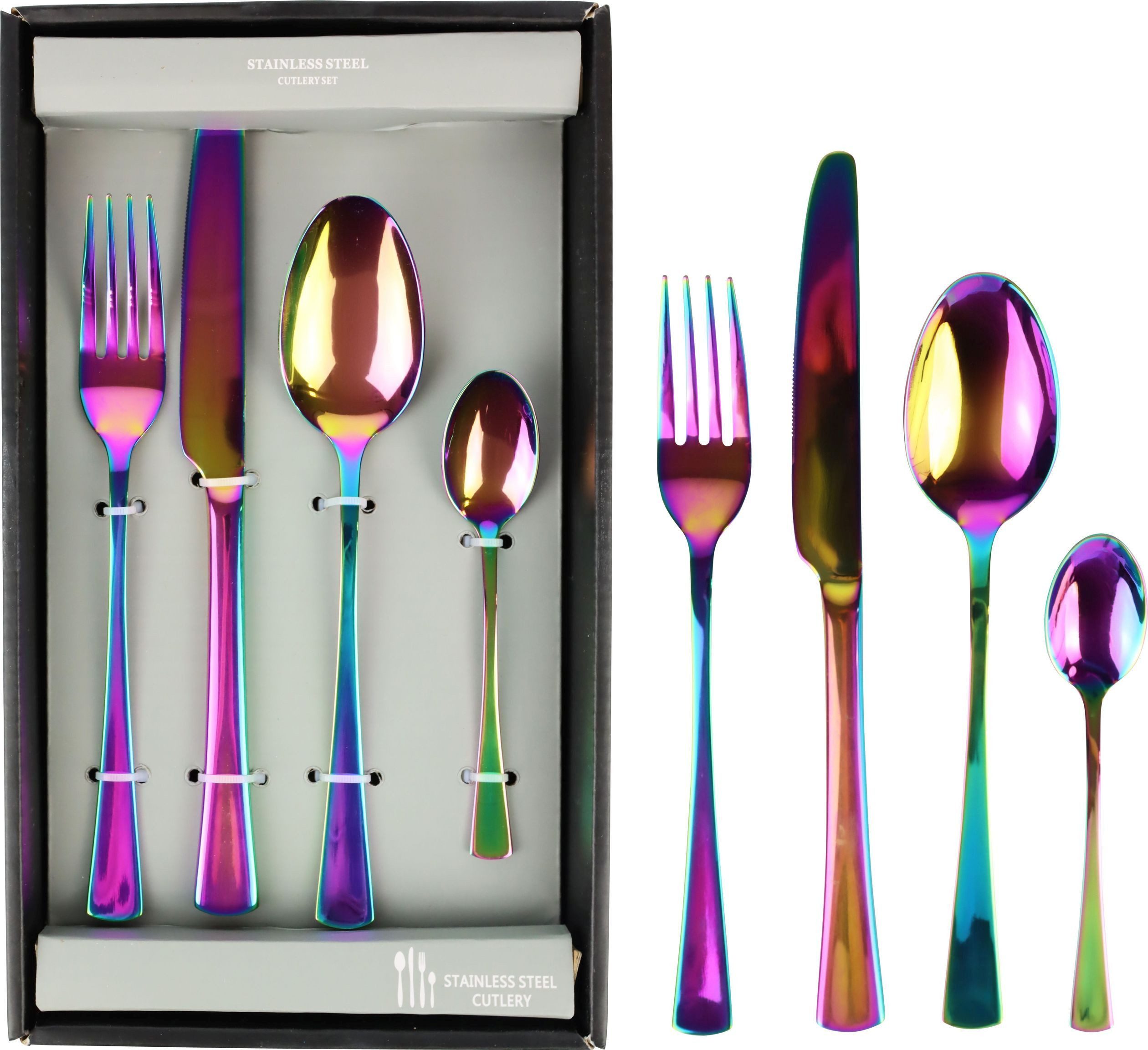 Farbenfrohes Design trifft auf hochwertige Verarbeitung: Das FURNARO Besteckset Rainbowbringt mit seiner glänzenden Regenbogenbeschichtung moderne Eleganz auf jeden Tisch. Das 24-teilige Set besteht aus je 6 Messern, Gabeln, Löffeln und Teelöffeln und ist aus robustem, rostfreiem Edelstahl gefertigt.