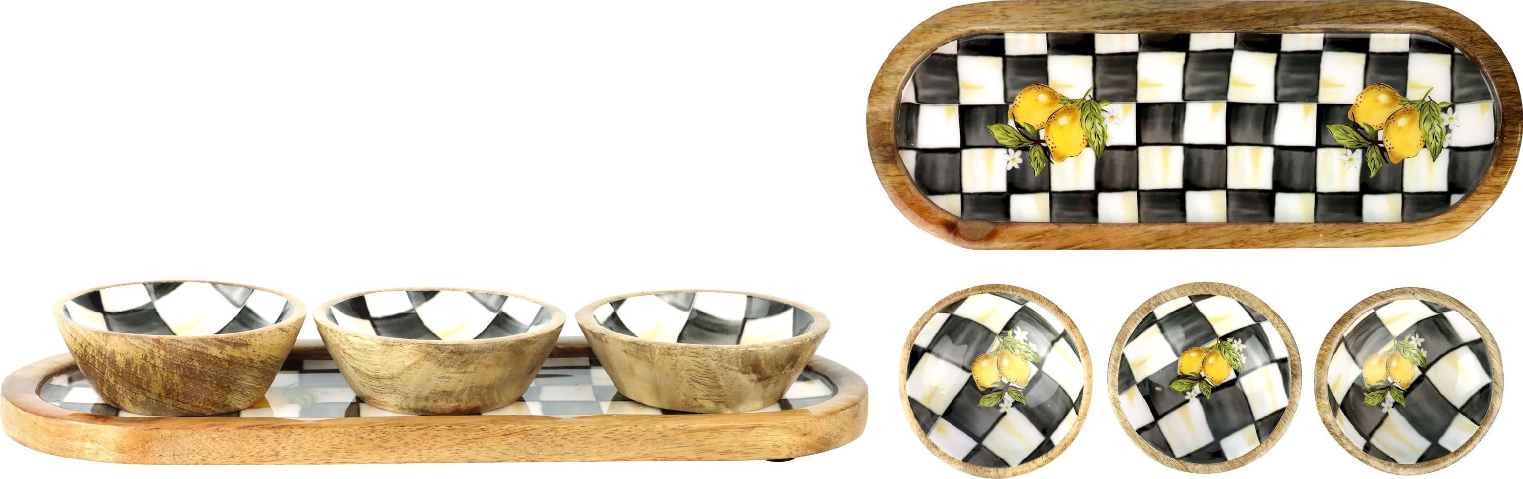 Das 4-teilige FURNARO Schalenensemble lemon bliss überzeugt mit mediterranem Charme. Drei Mangoholz-Schalen mit handbemalter Innenfläche treffen auf ein passendes Tablett mit Zitronendekor. Die Kombination aus natürlichen Materialien und farbenfrohem Muster bringt Sommerlaune auf den Tisch – perfekt für Dips, Snacks oder als dekoratives Set auf Sideboard oder Esstisch.Handbemalte Innenseiten mit ZitronenmotivMit passendem HolztablettAus natürlichem MangoholzDekorativ und funktional zugleich