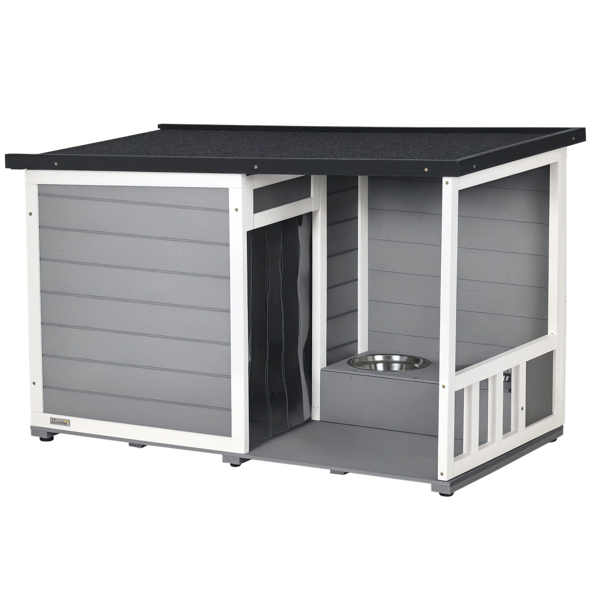 Diese Hundehütte bietet ihren Hunden einen komfortablen Unterschlupf und eine Veranda. So kann ihr Hund zwischen einem schattigem und sonnigem Bereich wählen. Die wetterbeständigen Materialien und das Asphaltdach sorgen dafür, dass die Hütte auch Regen übersteht. Erhöhte Näpfe sorgen dafür, dass Ihr Haustier eine gute Haltung beim Fressen und Trinken einnimmt, was zu einer guten Verdauung beiträgt. Dieses Hundehaus ist ein wahrer Hundehimmel.