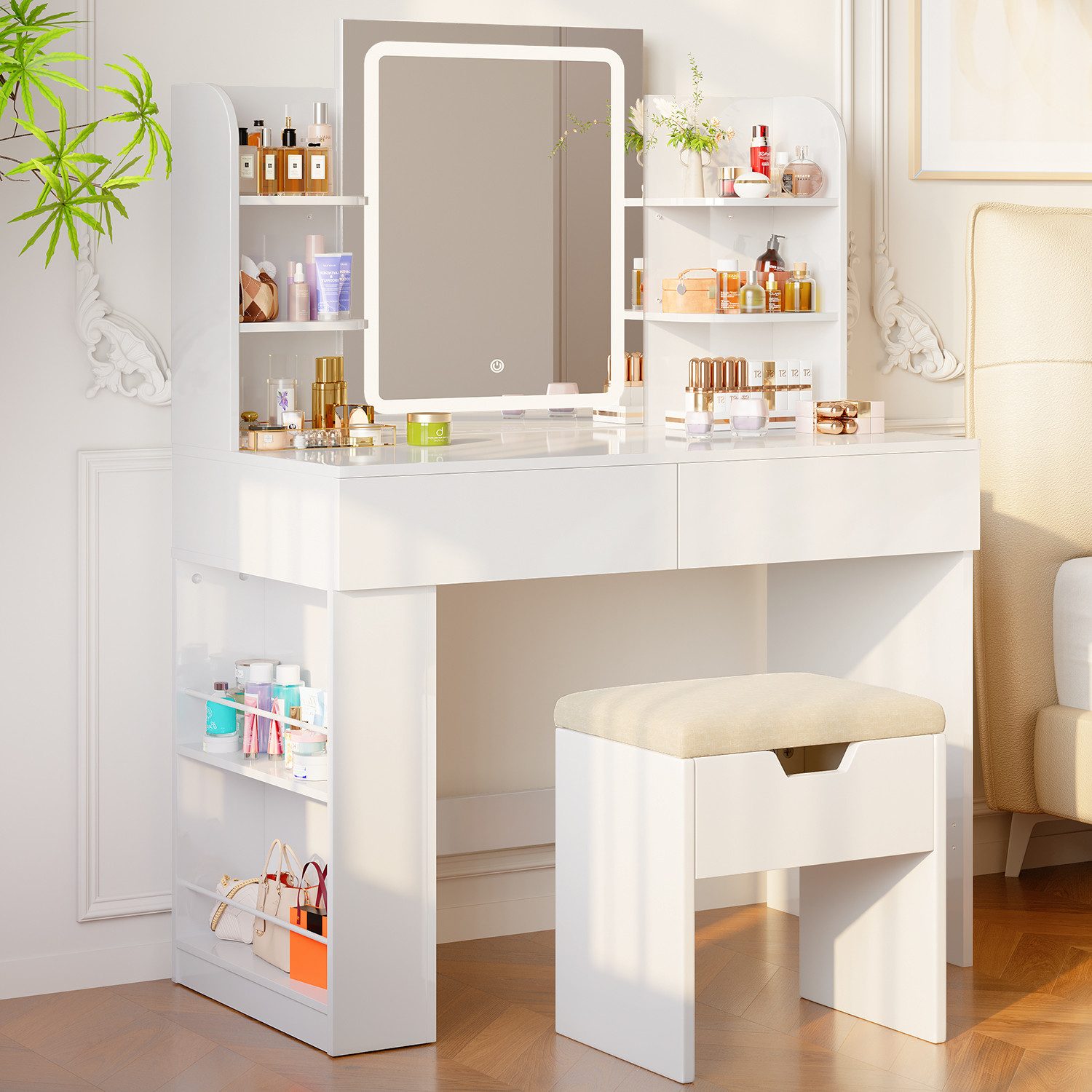 2 Schubladen: Der geschlossene Raum eignet sich zur Aufbewahrung von privaten Gegenständen (z. B. Schmuck, Make-up-Entferner) oder etwas größeren Gegenständen (z. B. Lockenstab, Kosmetiktasche), schützt vor Staub und Feuchtigkeit und sorgt für eine aufgeräumte Arbeitsfläche.
