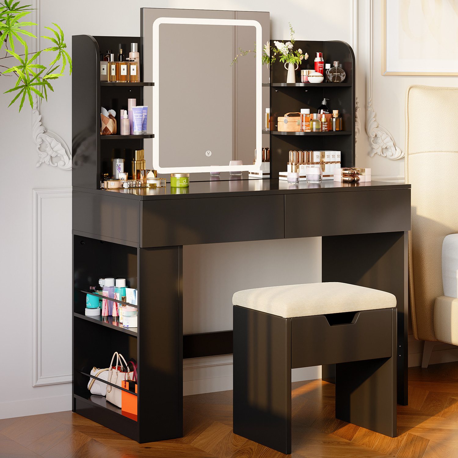 Vorteile der Aufbewahrung: Durch die Kombination aus „offenen Fächern + geschlossenen Schubladen” lassen sich Kosmetika und Werkzeuge ordentlich verstauen, wodurch Unordnung auf dem Tisch vermieden und die Effizienz gesteigert wird.