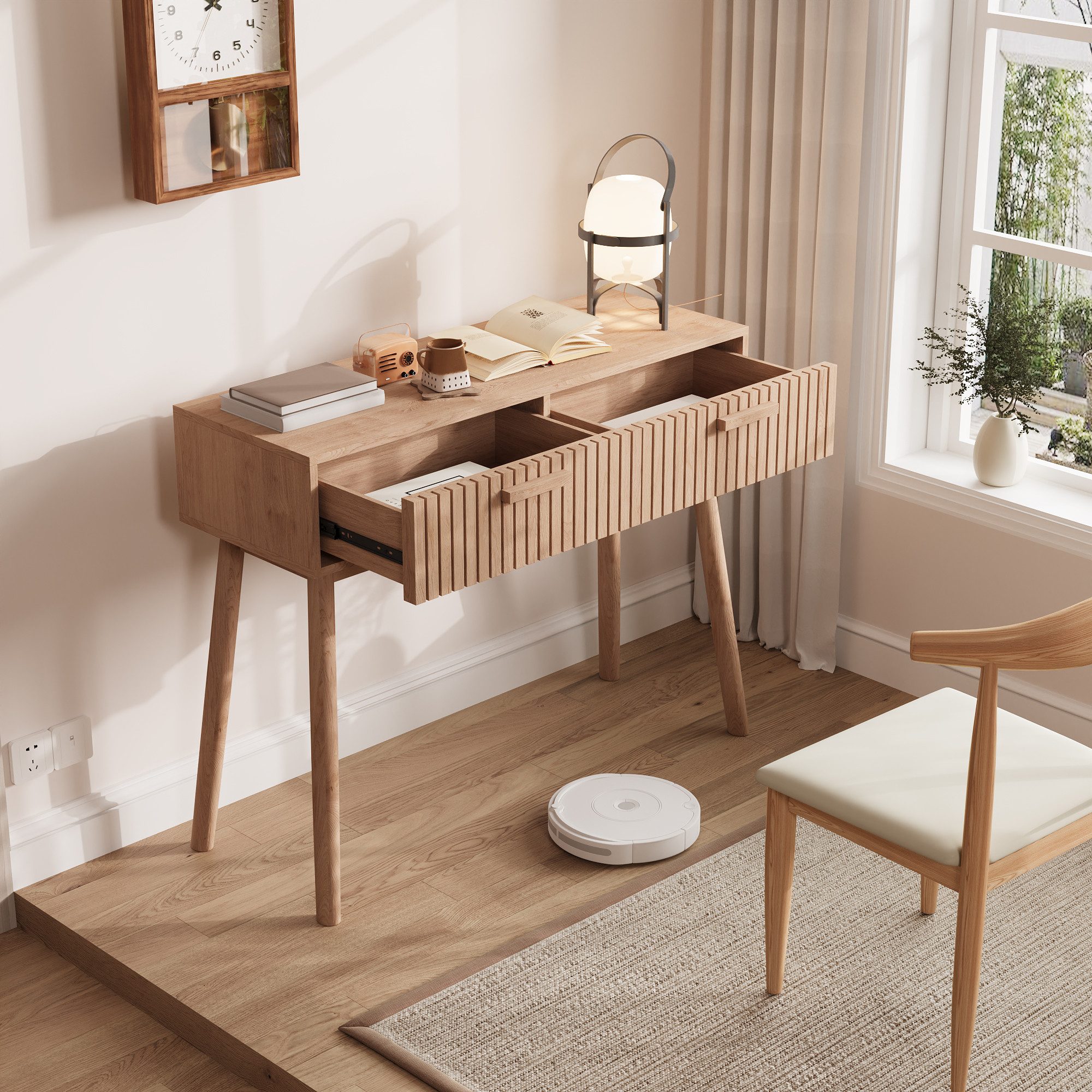 Dieser einzigartige Konsolentisch kombiniert praktische Aufbewahrung mit rustikalem Design und hochwertiger Handwerkskunst. Dieser 100 x 35 x 80 cm große Schreibtisch hat 2 Schubladen und bietet viel Platz, um Ihre Sachen ordentlich aufzubewahren. Die Schubladen verfügen über stilvolle Holzlatten und Holzgriffe, die zu jedem minimalistischen, modernen Lebensstil passen.