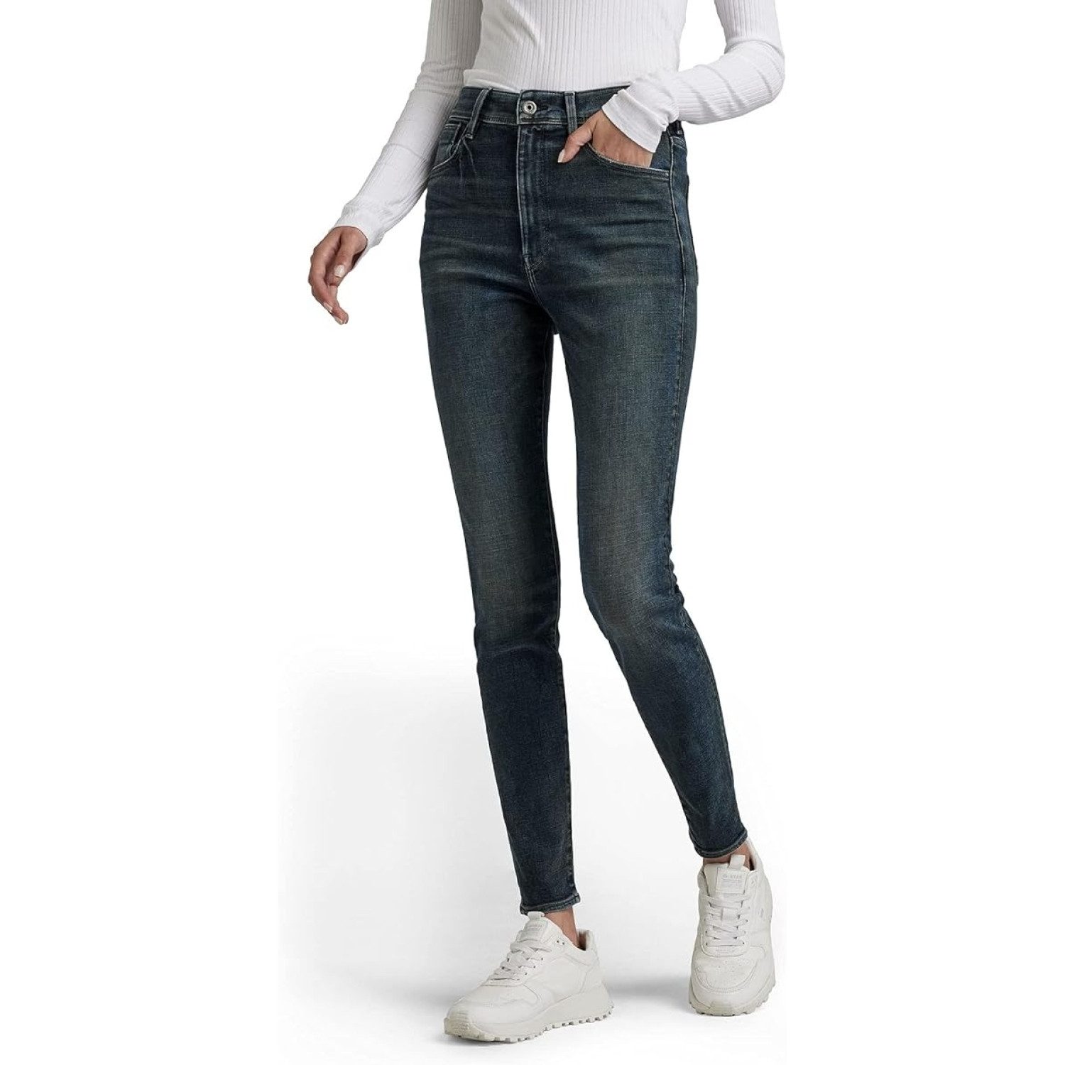 Diese Version der Kafey Skinny Jeans ist mit einem hohen Bund gestaltet. Die Gesäßtaschen der 5-Pocket-Jeans sind weiter oben an der rückseitigen Passe positioniert. An der Vorderseite sind die Taschenecken mit Nieten verstärkt.