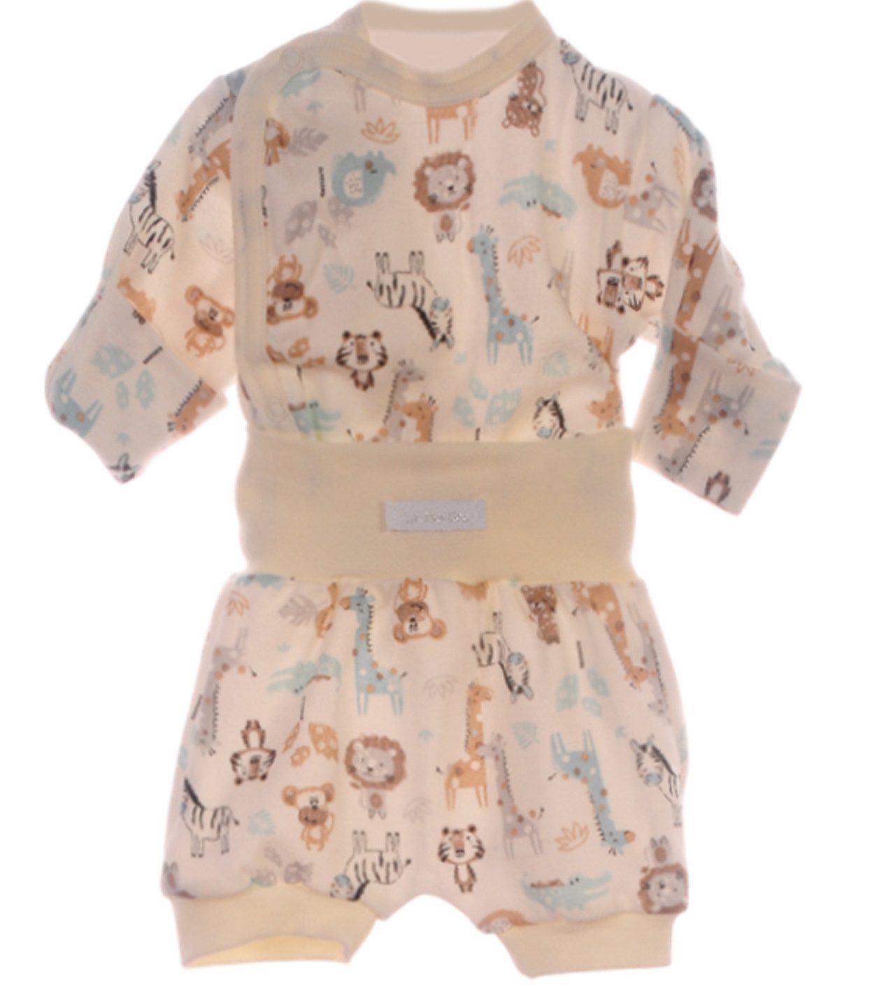 Dieses süße 2-teilige Babyset besteht aus einem praktischen Wickelhemdchen mit Kratzschutz und einer bequemen Shorts mit elastischem Bund. Beide Teile sind in einem sanften Cremeton gehalten und mit liebevollen Safari-Tiermotiven verziert. Das Wickelhemdchen ist aus 100 % reiner Baumwolle gefertigt, angenehm weich und hautfreundlich – ideal für empfindliche Babyhaut. Die Shorts sorgt dank des elastischen Bundes aus 95 % Baumwolle und 5 % Elasthan für eine bequeme Passform und viel Bewegungsfreiheit. Ein vielseitiges, sommerliches Set, passend für Baby Mädchen und Jungen – perfekt für den Alltag, warme Tage oder als liebevolles Geschenk zur Geburt.