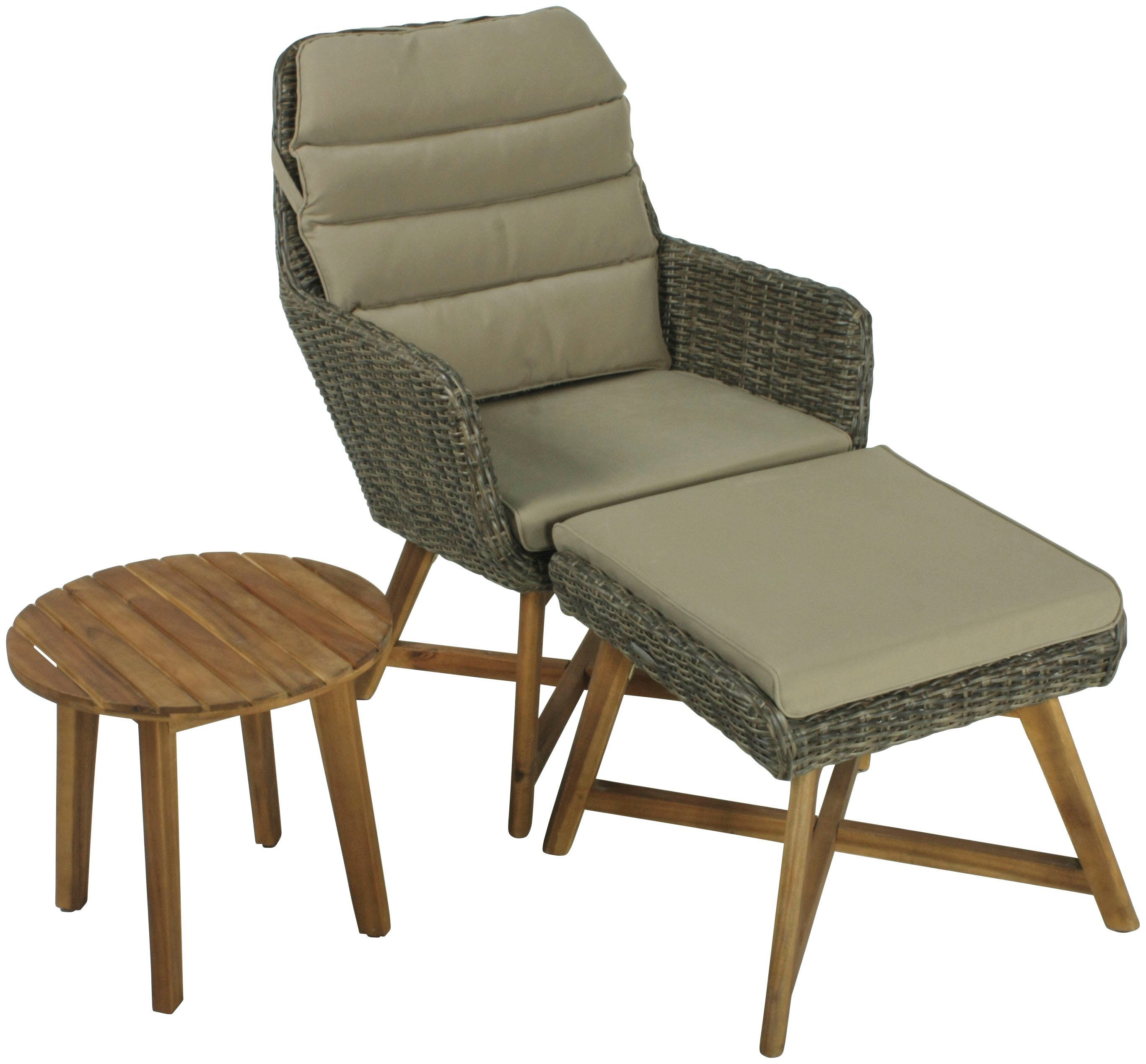 Das bequeme Gartenmöbelset »CALVIA« von Garden Pleasure lädt zum Relaxen im Freien ein. Es zeichnet sich durch eine moderne Gestaltung aus und begeistert mit einer attraktiven Farbkombination. Zur Ausstattung gehört ein Beistelltisch aus FSC®-zertifiziertem Massivholz, der mit einem natürlichen Aussehen und robusten Eigenschaften besticht. Der Gartenstuhl sowie der Hocker überzeugen ebenfalls mit Stabilität und Langlebigkeit. Dank einer Sitzfläche aus Kunststoff und einer bequemen Sitzauflage ermöglichen sie einen hohen Komfort für entspannte Stunden. Sorgt für Gemütlichkeit im Außenbereich: das bequeme Gartenmöbelset »CALVIA« von Garden Pleasure.