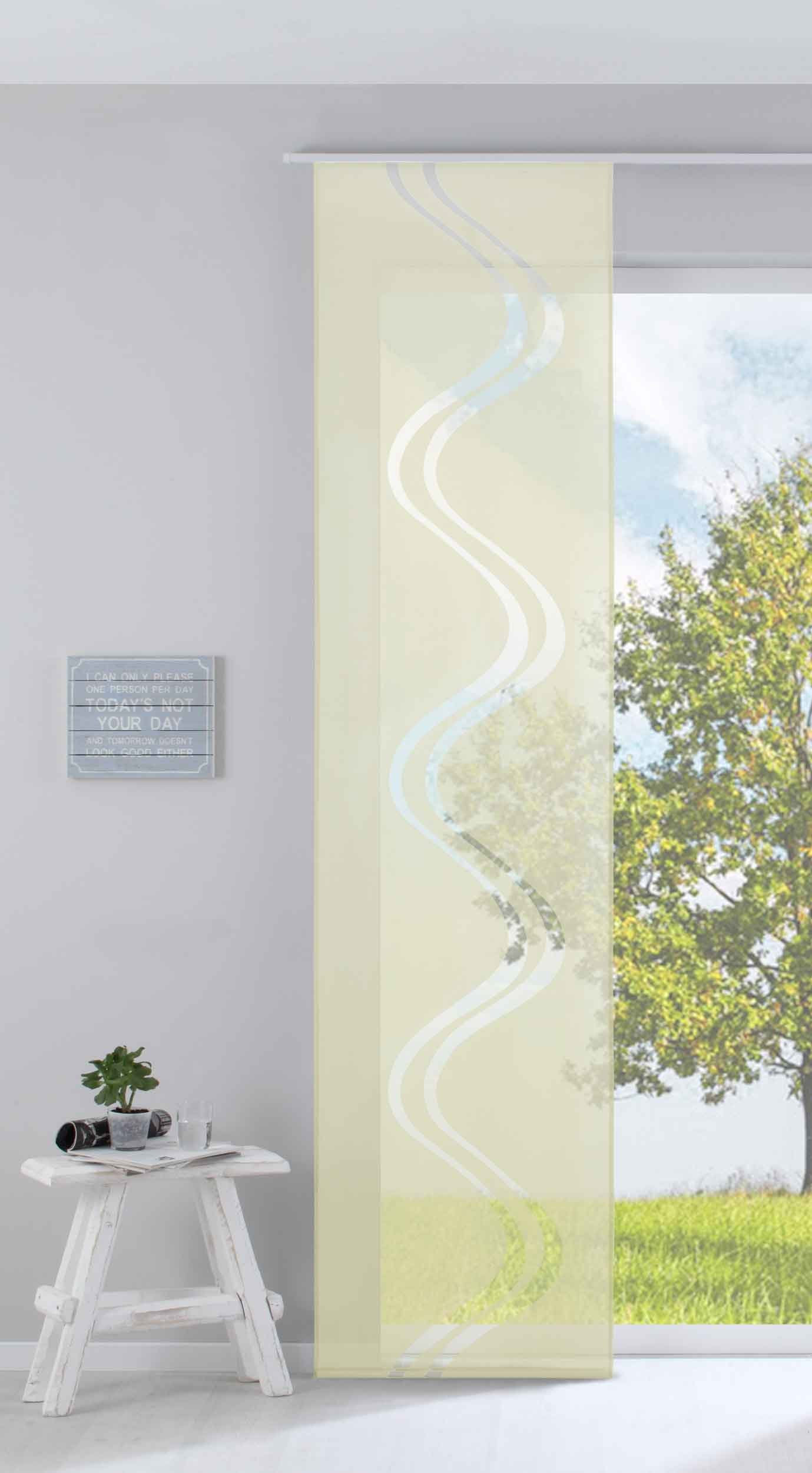 Moderner Flächenvorhang / Schiebegardine aus Ausbrenner-Stoff mit Wellen-Motiv, mit Klettband einfach abnehmbar und leicht anzubringen. incl. Panelwagen und Beschwerungsstange. Durch das aufwendige Ausbrenner-Verfahren wird aus dem blickdichten Schiebevorhang das Motiv transparent ausgebrannt. Bei Sonneneinstrahlung entsteht ein zauberhaftes Lichtspiel in Ihrem Ambiente.