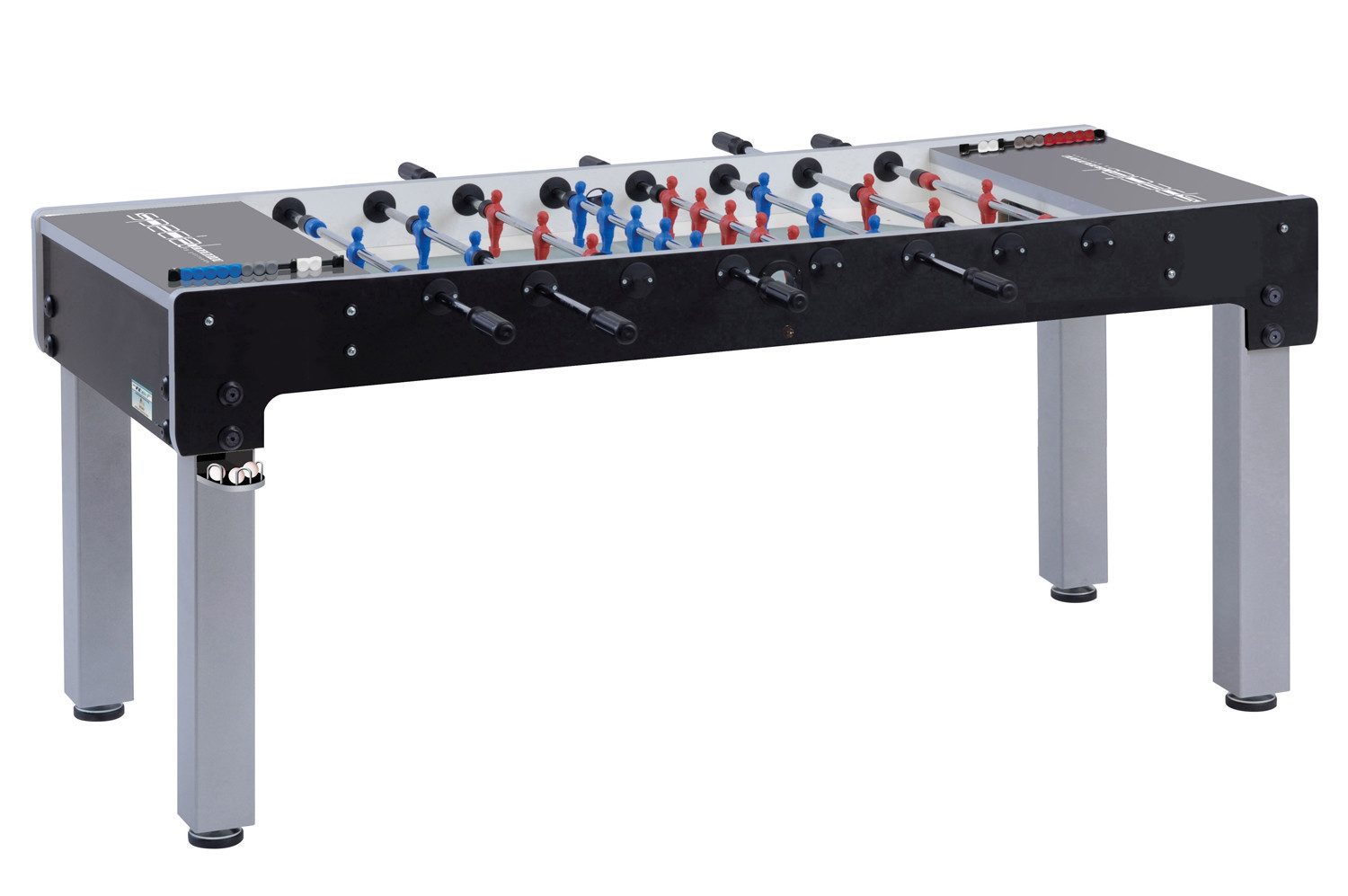 Tischkicker speziell entwickelt für Spieler im Rollstuhl Korpus aus 25 mm starkem MDF mit Melaminbeschichtung viereckige Metallbeine (9 x 9 cm) mit Pulverbeschichtung höhenverstellbare Stellfüße mit rutschfester Gummiauflage 16 mm Teleskopstangen aus verchromten und rostfreiem Stahl Kugellager aus Stahl für hohe Leichtgängigkeit und Spielgeschwindigkeiten ergonomisch geformte Kunststoffgriffe einfache Ballentnahme in angepasster Höhe Turnier-Torzähler mit Anzeige des Spielsets und erzielten Toren