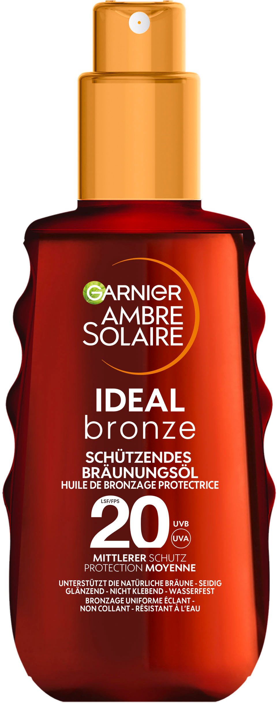 Anwendung | Das Garnier Ambre Solaire Ideal Bronze Schützende Sonnenöl mit Lichtschutzfaktor 20 vor dem Sonnenbaden großzügig auf den Oberkörper, die Arme sowie die Beine aufsprühen und für eine gleichmäßige Bräune mit den Händen sanft einmassieren. Den Sonnenschutz regelmäßig auffrischen, besonders nach einem Aufenthalt im Wasser, nach dem Schwitzen oder Abtrocknen. Den Kontakt mit den Augen vermeiden. Sollte der Sonnenschutz in die Augen gelangen, diese umgehend gründlich unter klarem Wasser ausspülen. Die Mittagssonne meiden und zusätzlich schützende Kleidung verwenden. Um den Lichtschutzfaktor aufrechtzuerhalten, sollte die Sonnencreme mehrfach und vor allem regelmäßig aufgetragen werden. |