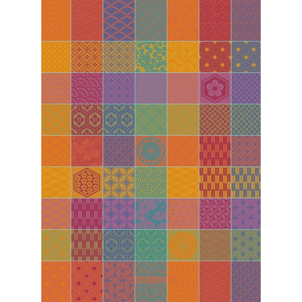 Pflegehinweise | MotivbeschreibungDieses Geschirrtuch zeigt ein Patchwork-Design mit einer Vielzahl von traditionellen japanischen Mustern, die in einem Raster angeordnet sind. Die Farbpalette ist warm und lebendig und umfasst eine Mischung aus Rottönen, Orangetönen, Gelbtönen, Violetttönen und Grüntönen. Die Muster reichen von geometrischen Formen wie Kreisen und Sechsecken bis hin zu stilisierten Darstellungen von Blumen und Wellen. |