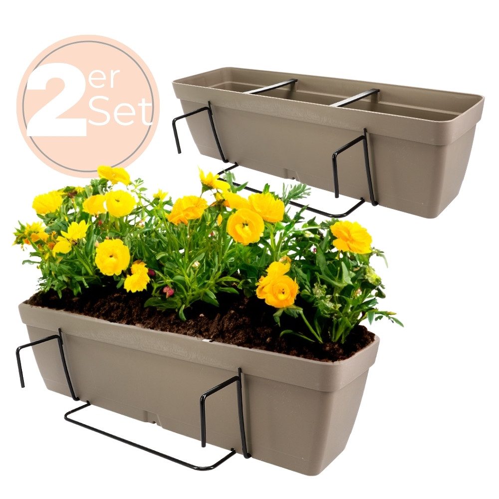 Der Balkonkästen mit Aufhängung bietet Ihnen zahlreiche Einsatzmöglichkeiten. Er kann sowohl direkt auf Ihrem Balkon oder Ihrer Terrasse aufgestellt werden als auch sicher an Balkonbrüstungen oder Zäunen befestigt werden. Dank der im Lieferumfang enthaltenen hochwertigen Metall-Halterungen, die eine Materialstärke von 5,5 mm aufweisen, ist der Kasten besonders stabil und langlebig. Diese robusten Halterungen sind für Geländer und Brüstungen mit einer Tiefe von bis zu 7 cm geeignet und garantieren eine sichere und stabile Befestigung.
