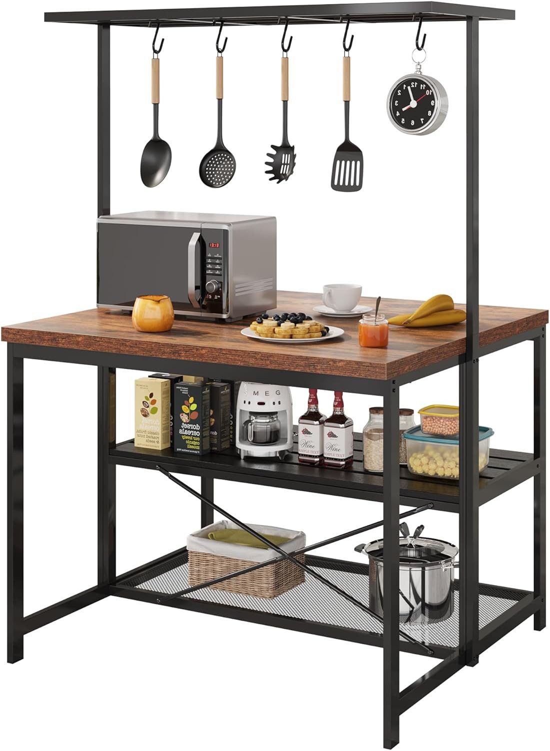 3-stöckige Aufbewahrung & 5 Haken:Das geräumige offene Regal bietet viel Platz für Töpfe, Pfannen, Küchenutensilien, Mikrowelle, Toaster und andere kleine Küchengeräte. Die 5 S-Haken eignen sich perfekt zum Aufhängen von Kochutensilien, Löffeln, Pfannen oder Küchentüchern.
