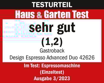 Die Gastroback Design Espresso Advanced Duo 42626 erzielt im Einzeltest des Magazins „Haus & Garten Test“ das Gesamtergebnis „sehr gut (1,2)“. Die hervorragende Funktion erhält die Bestnote „1,0“. Das Gerät ist hochwertig verarbeitet. Außerdem ist es bedienfreundlich und sehr leicht zu reinigen. Insgesamt liefert das Modell „Espresso der Meisterklasse“.