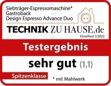 Die GASTROBACK Design Espresso Advanced Duo erzielt im Vergleichstest mit drei weiteren Espressomaschinen mit Mahlwerk das Gesamtergebnis „sehr gut (92,8 %)“. U. a. sind die Qualität des Brühresultats und das Tempo „sehr gut“. Das Gerät ist sehr einfach zu bedienen, „gut“ zu reinigen und hat „sehr gutes“ Zubehör. Der Schallausstoß ist sehr gering. Außerdem ist es hochwertig verarbeitet. Insgesamt erreicht das Modell das drittbeste Ergebnis im Test und ist der „PREIS-LEISTUNGSSIEGER“.