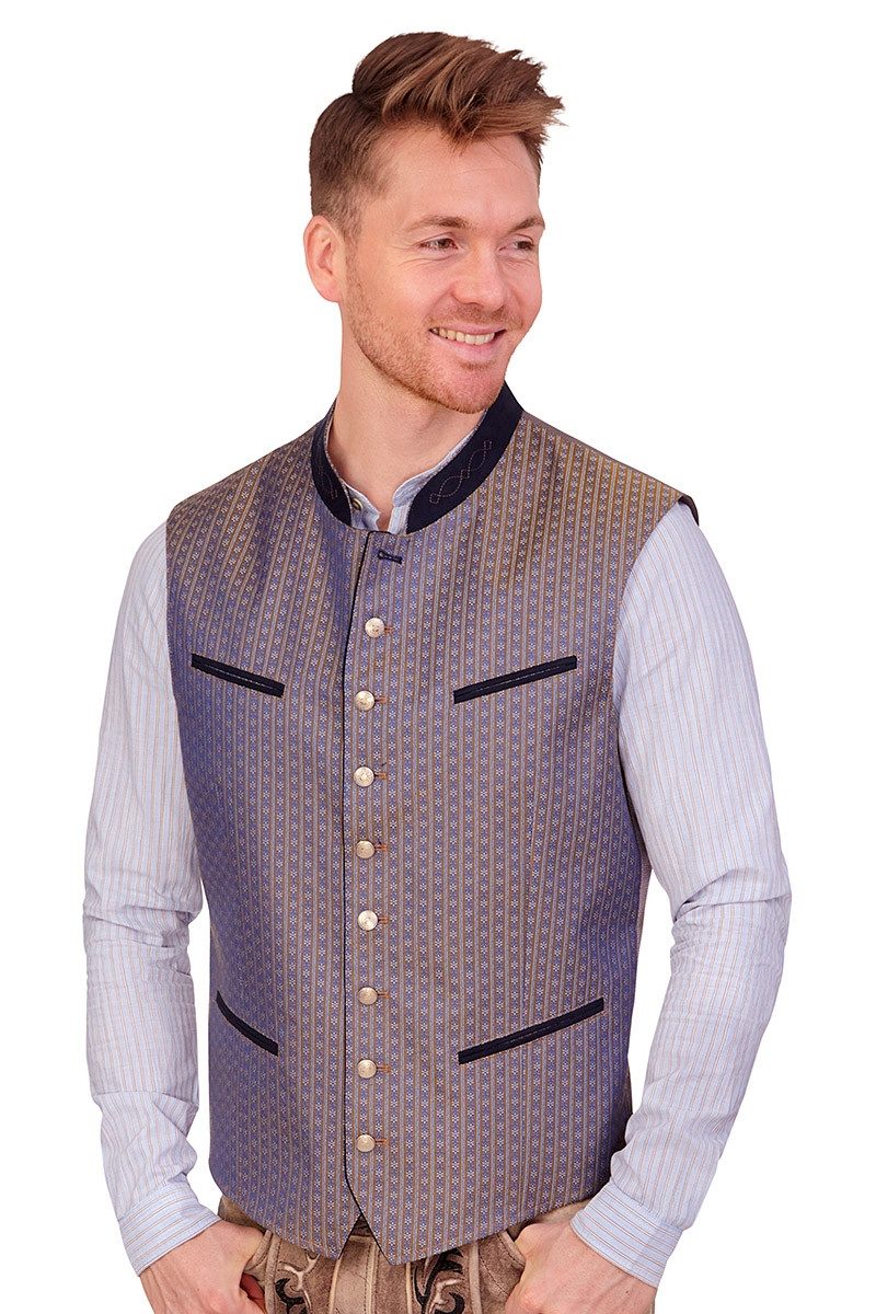 Bodensee, die eindrucksvolle Trachtenweste aus glanzvollem, changierendem Jacquard im floralen Streifen-Look, ist ein festlicher Begleiter zur Lederhose und stammt aus dem Hause Gebr. Weis. Der vordere Teil schimmert je nach Lichteinfall braun oder blau und zeigt ein schönes Streifen-Webmuster aus blumigen Ornamenten und feinen Ranken, die glänzende Rückseite hat ein ein zartes Rautengitter-Webmuster. Der Stehkragen mit dem edlen Veloursbesatz in Dunkelblau ist beidseitig vorn traditionell in Kontrastfarbe bestickt und oben mit einer Paspelkante aus Westenstoff betont. Goldige, zart gemusterte Knöpfe mit einem Motiv, das an eine analoge Uhr erinnert, zieren die Knopfleiste. Komplett wird die fantastische, sauber abgefütterte Herrenweste durch die je zwei Brust- sowie Eingrifftaschen mit doppelten Velours-Paspeln. Für den perfekten Sitz sorgt der Rückenriegel mit matt-silberner Schnalle. Bitte beachten Sie den Größenzuschlag ab Размер 28 bzw. 56.