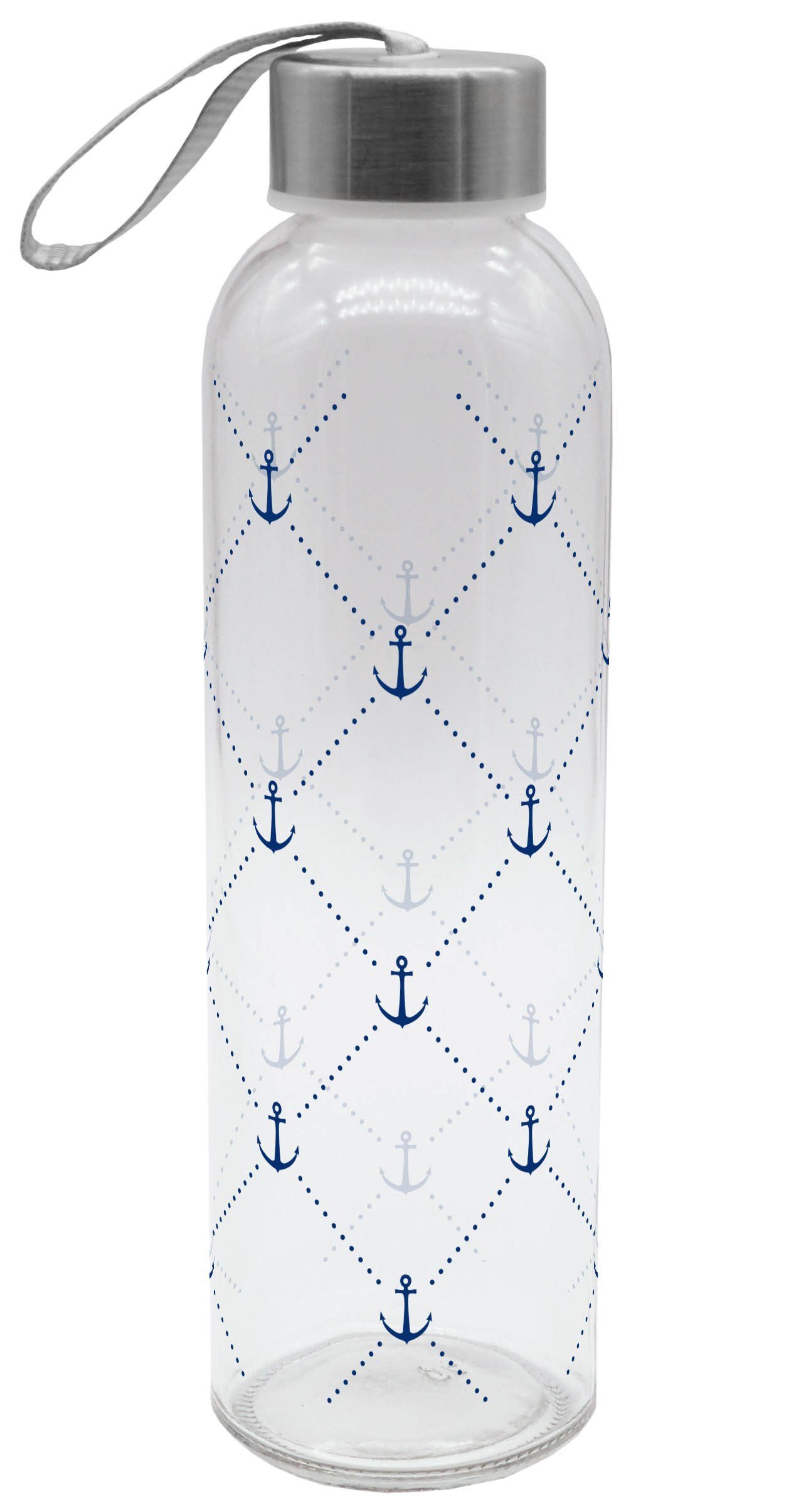 Die Trinkflasche Anker 500ml hat einen blauen Anker Allover-Print. Die Flasche im maritimen Look ist perfekt für den nächsten Ausflug ans Wasser und nicht nur für Landratten ein passendes Accessoire. In der Glasflasche kannst du sowohl kalte Getränke als auch heißen Tee abfüllen, denn das robuste Glas ist besonders hitzebeständig. Aber Vorsicht: Die heiße Glasflasche nicht direkt anfassen! Der silberne Drehverschluss verfügt über eine graue Trageschlaufe. Mit 500ml Fassungsvermögen für dein Wellness-Wasser, deinen Yogi-Tee oder deinen Smoothi ist die Glastrinkflasche ein guter Begleiter für die Schule, Uni, das Büro oder einfach für unterwegs.