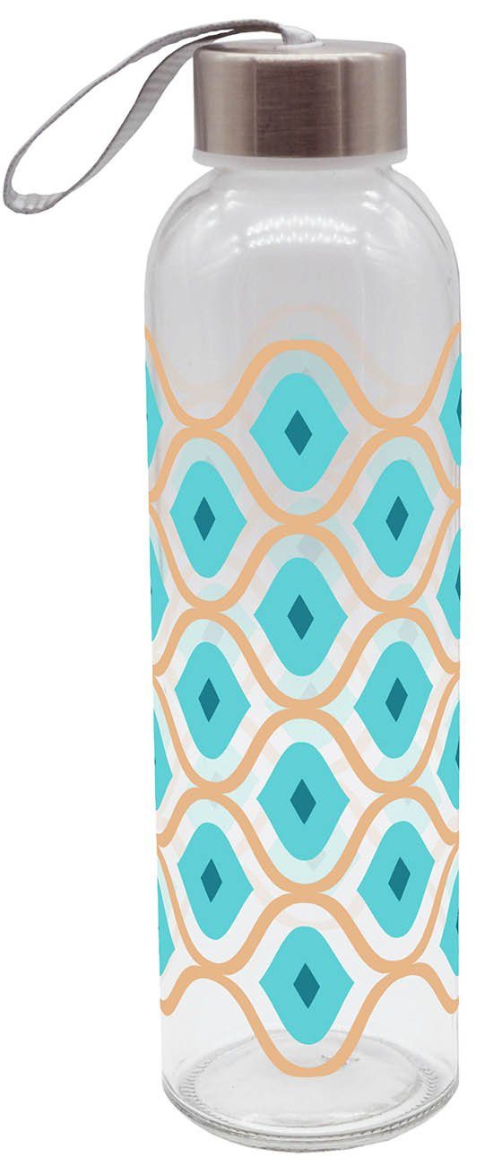 Die Trinkflasche Retro Glas 500ml verkörpert den Charme vergangener Zeiten. Die trendige Farbgebung in türkis und ocker versprüht Lebensfreude und Nostalgie. Für Designbegeisterte kann diese Trinkflasche im Retro-Stil ein treuer Begleiter werden. In der Glasflasche können Kaltgetränke und sogar Tee zubereitet werden, denn das stabile Glas ist hitzebeständig. Aber Vorsicht: Die heiße Glasflasche nicht sofort anfassen! Der silberne Drehverschluss verfügt über eine praktische Trageschlaufe. Mit 500ml Fassungsvermögen für dein Wellness-Wasser, deinen Yogi-Tee oder deinen Smoothie ist die Glastrinkflasche ein guter Begleiter für die Schule, Uni, das Büro oder Sport.