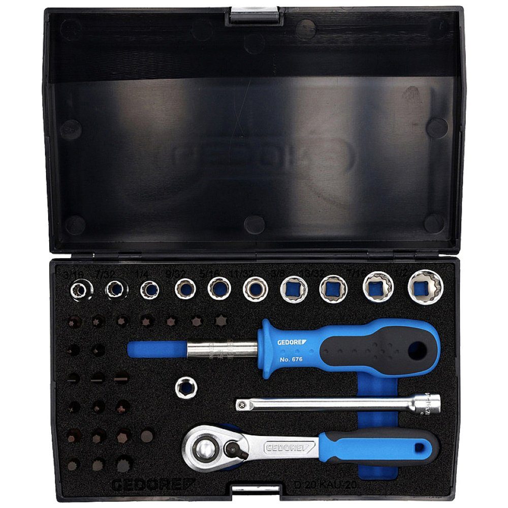 Steckschlüsselsatz mit geschmiedeten, vergüteten, handbetätigten 12-kant UD-Profil Steckschlüsseleinsätzen. Betätigungswerkzeuge aus GEDORE Vanadium-Stahl 31CrV3