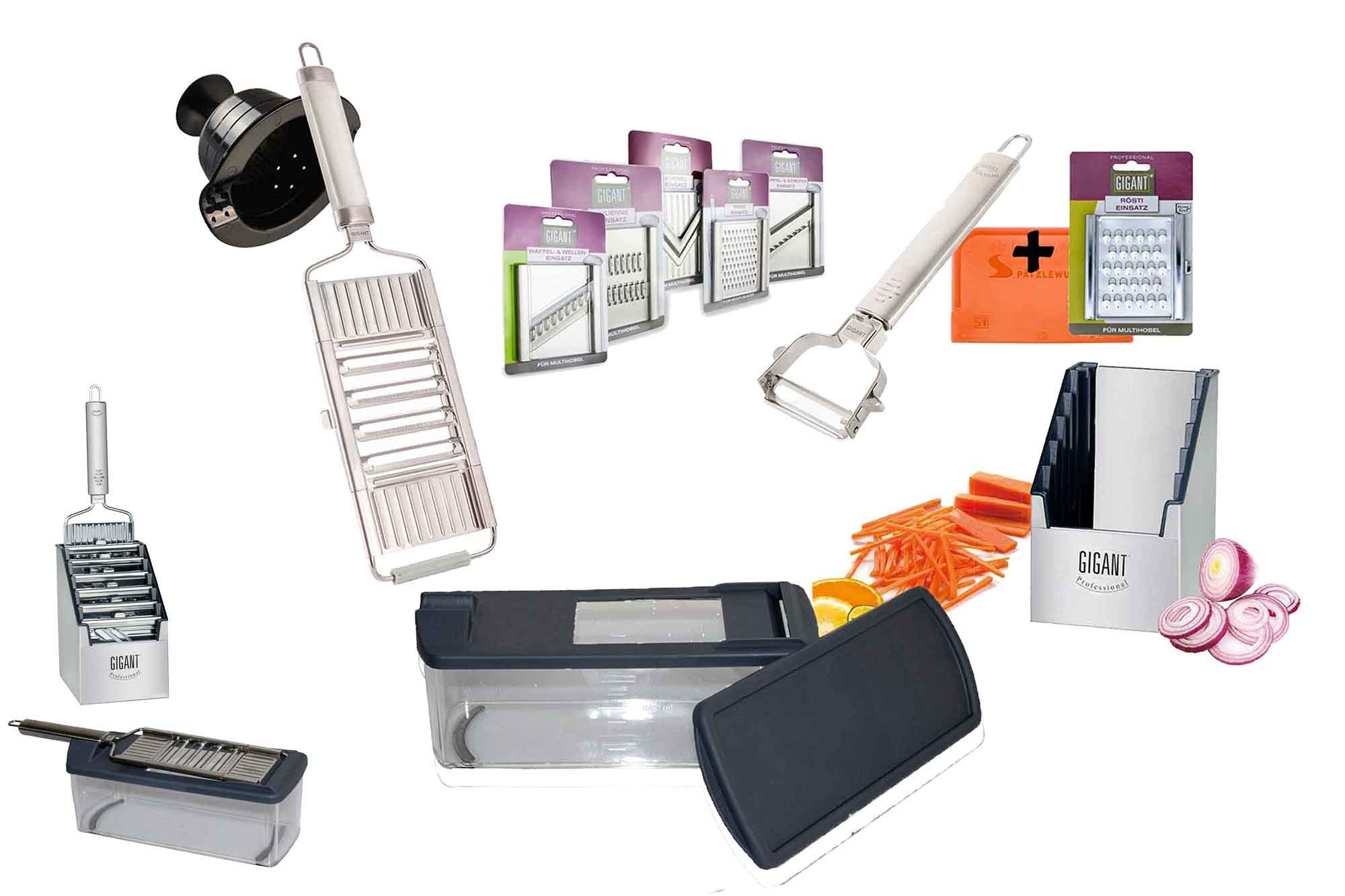 Damit Sie alles vorher leicht und einfach schälen können, ergänzt der bewährte Gigant Sparschäler mit seiner doppelten Zackenklinge das Меню.