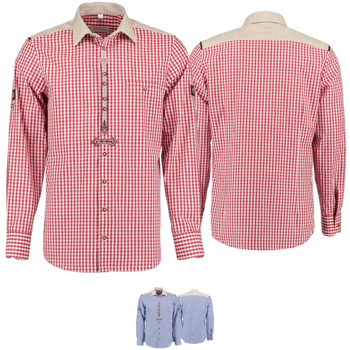 Slim fit Trachtenhemd für Lederhosen Langarm Trachtenmode mit Stickerei, Farbe: Rot/ D.Blau