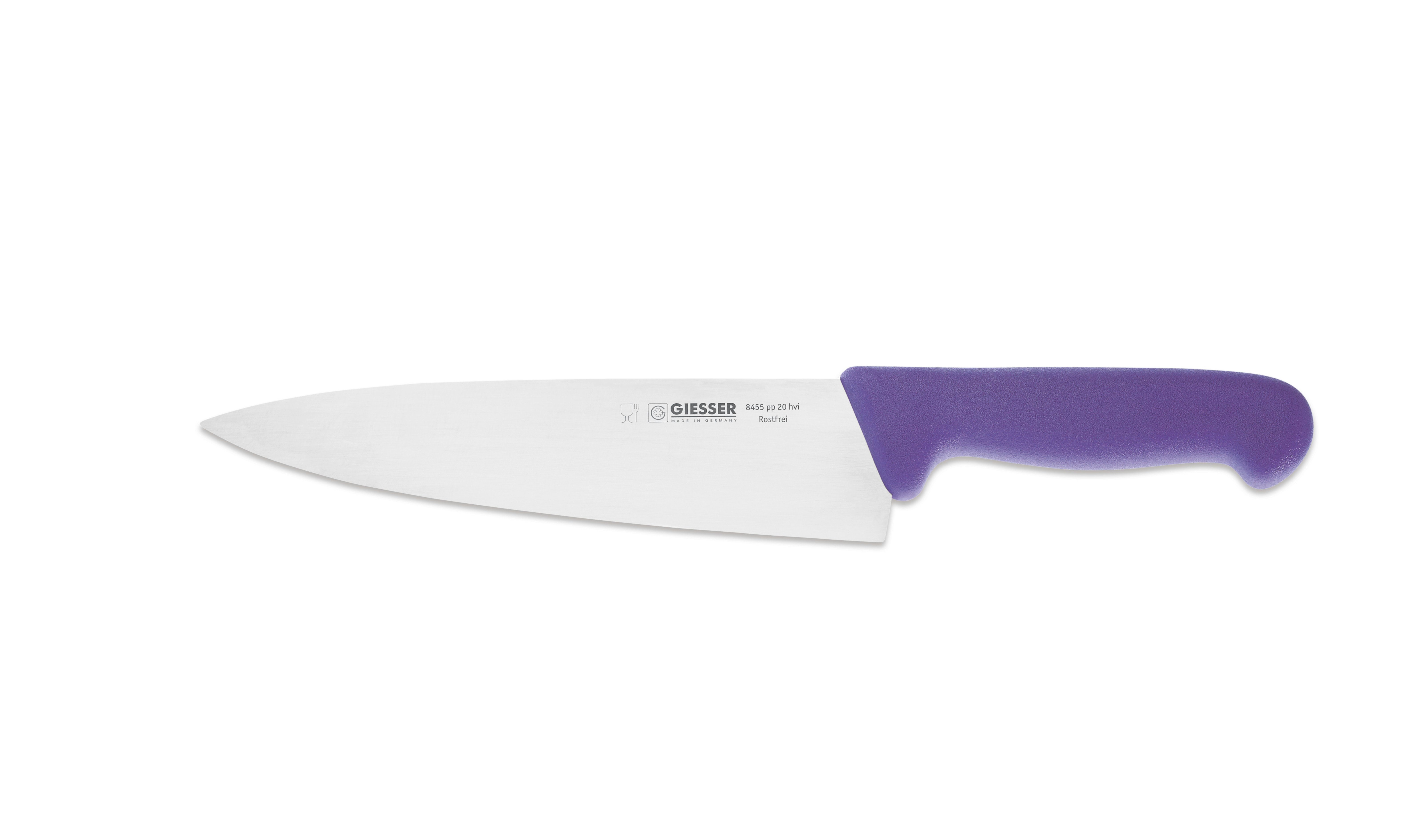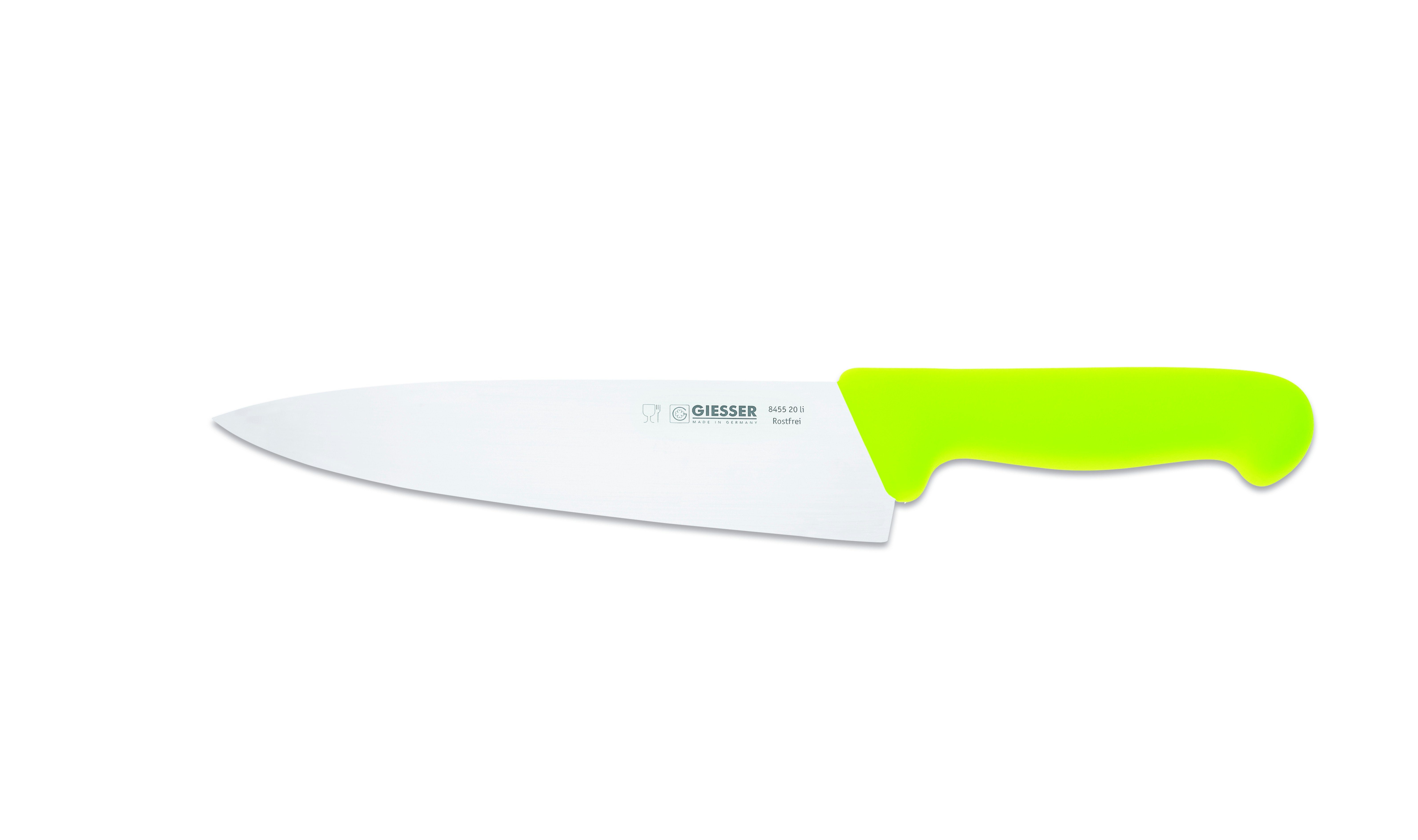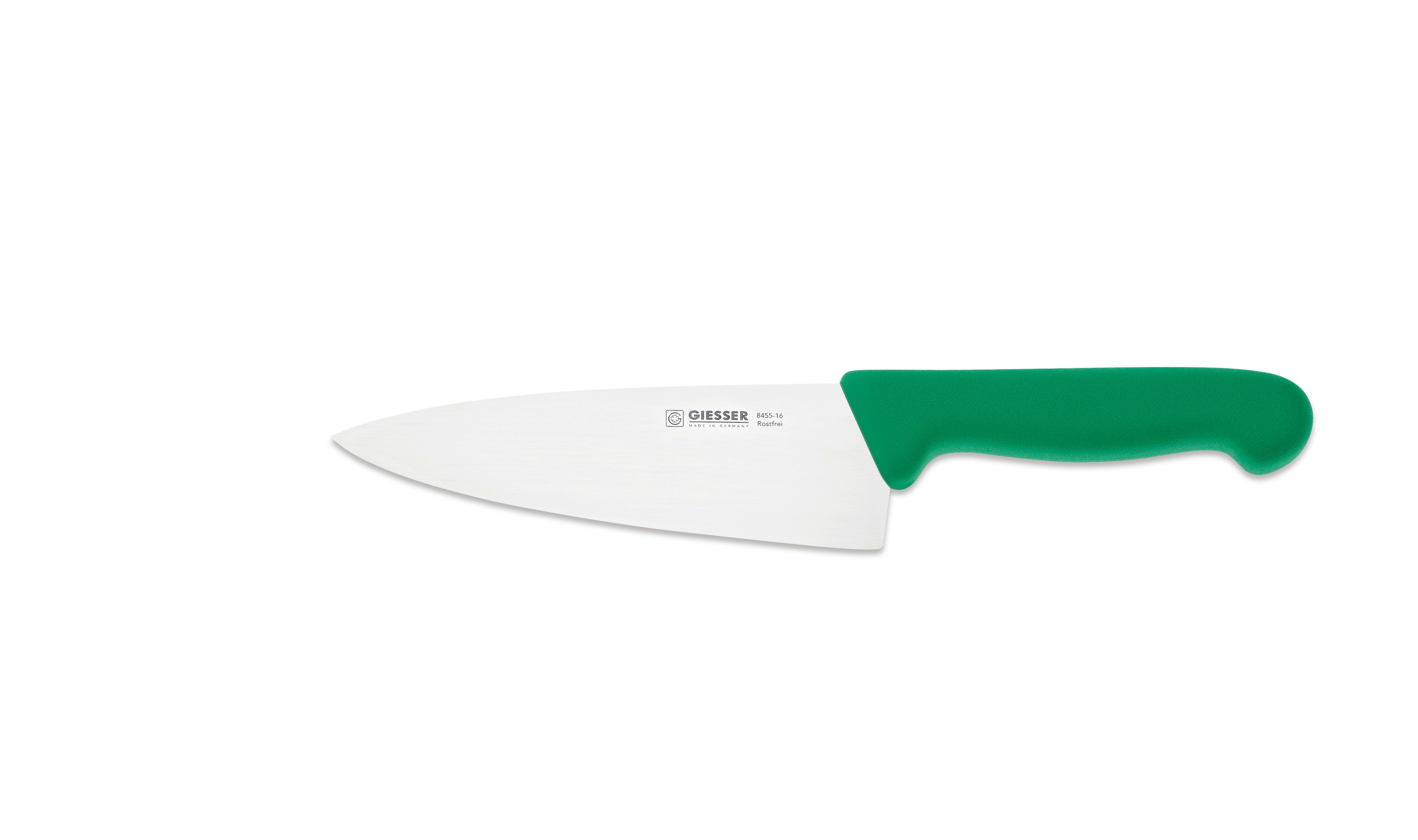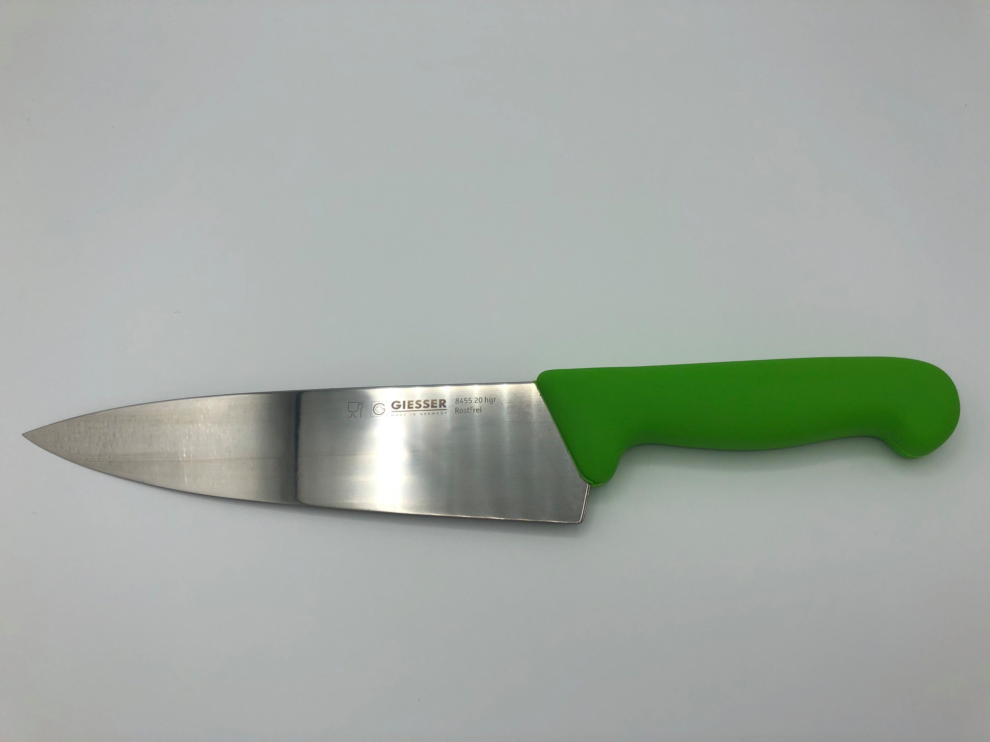 Das Giesser Kochmesser 8455 ist ein hochwertiges Messer der renommierten deutschen Messerschmiede Johannes Giesser Messerfabrik GmbH. Es verfügt über eine scharfe Klinge aus Chrom-Molybdän-Spezialstahl, die durch einen speziellen Schliff besonders effizient schneidet. Mit einer Härte von 55 bis 56 HRC und einer Длина von 16 cm bis 31 cm ist das Messer ideal für viele Küchenarbeiten wie das Schneiden von Obst, Gemüse oder Fleisch. Die schmale, mittelspitze Klingenform und der abgerundete Messerrücken sorgen für maximale Kontrolle und Präzision beim Schneiden. Der ergonomisch geformte und rutschfeste Griff aus TPE-Kunststoff ist in den Farben schwarz, blau, braun, gelb, grün, limette, pink, rot, weiß und halal violett erhältlich und bietet eine hervorragende Balance zwischen Klinge und Griff für ermüdungsfreies Schneiden. Das Kochmesser ist ein hochwertiges Werkzeug für den täglichen Gebrauch in der Küche und hat eine lange Lebensdauer. Zudem ist es Made in Germany und spiegelt die hohe Qualität und jahrzehntelange Erfahrung der Johannes Giesser Messerfabrik GmbH wider.