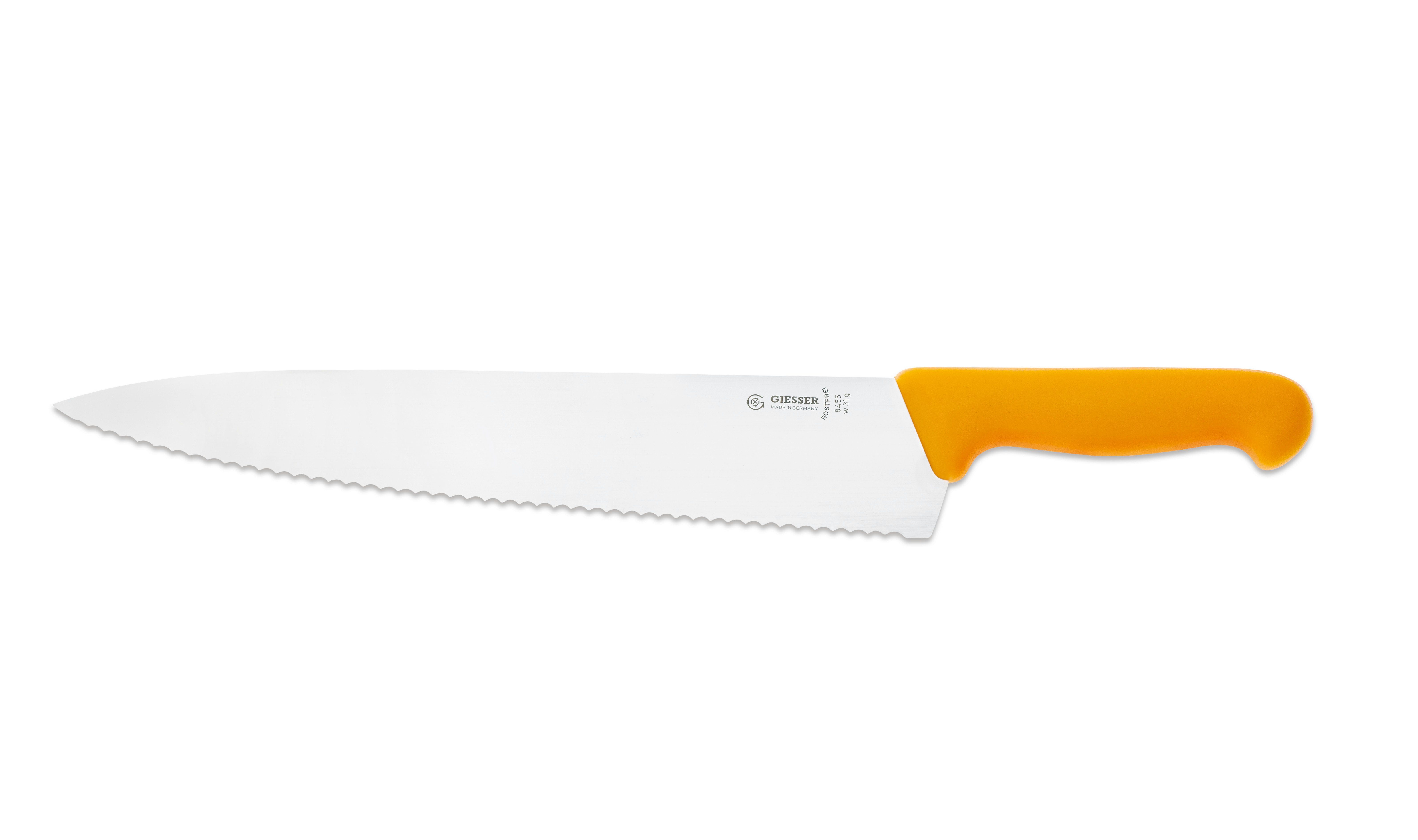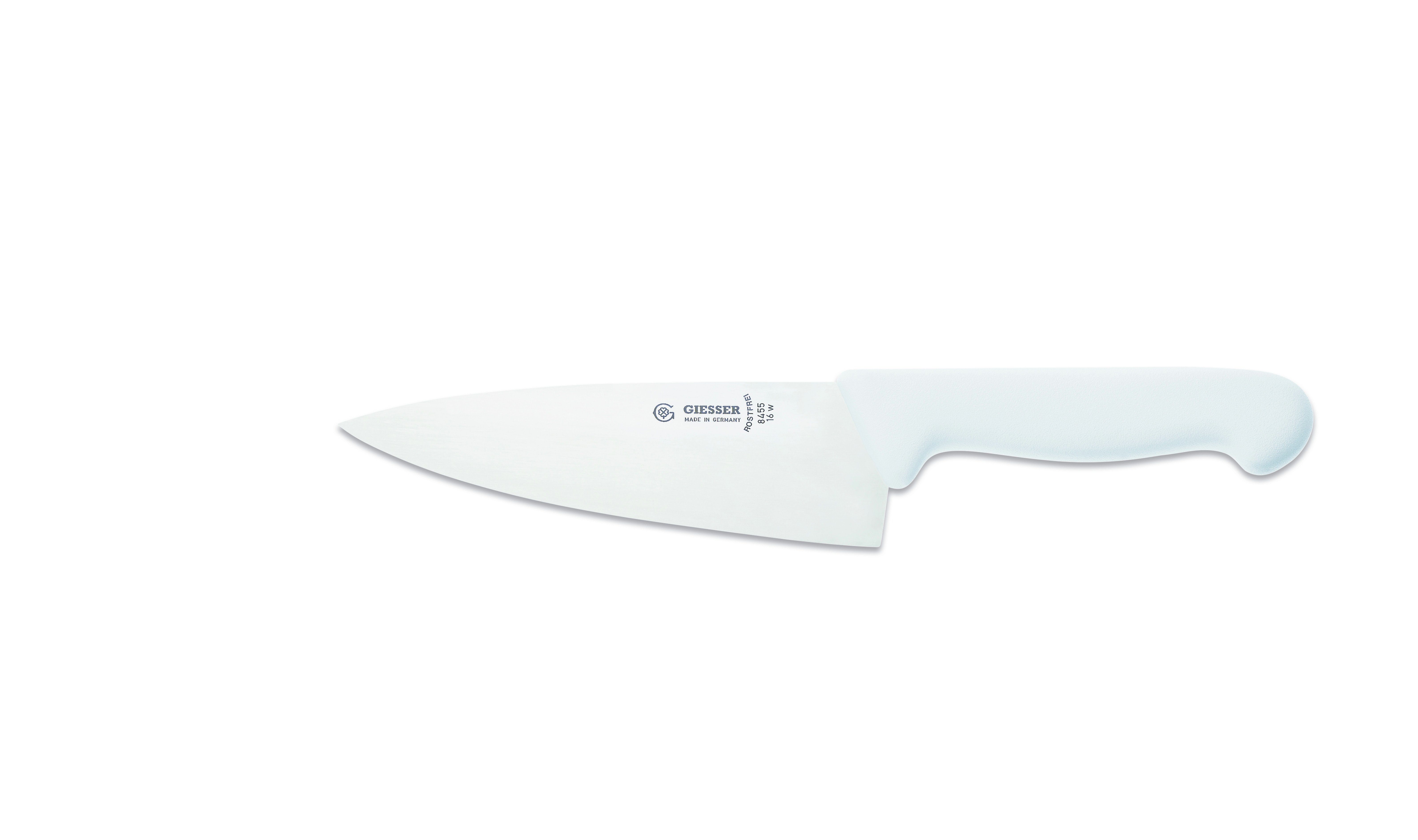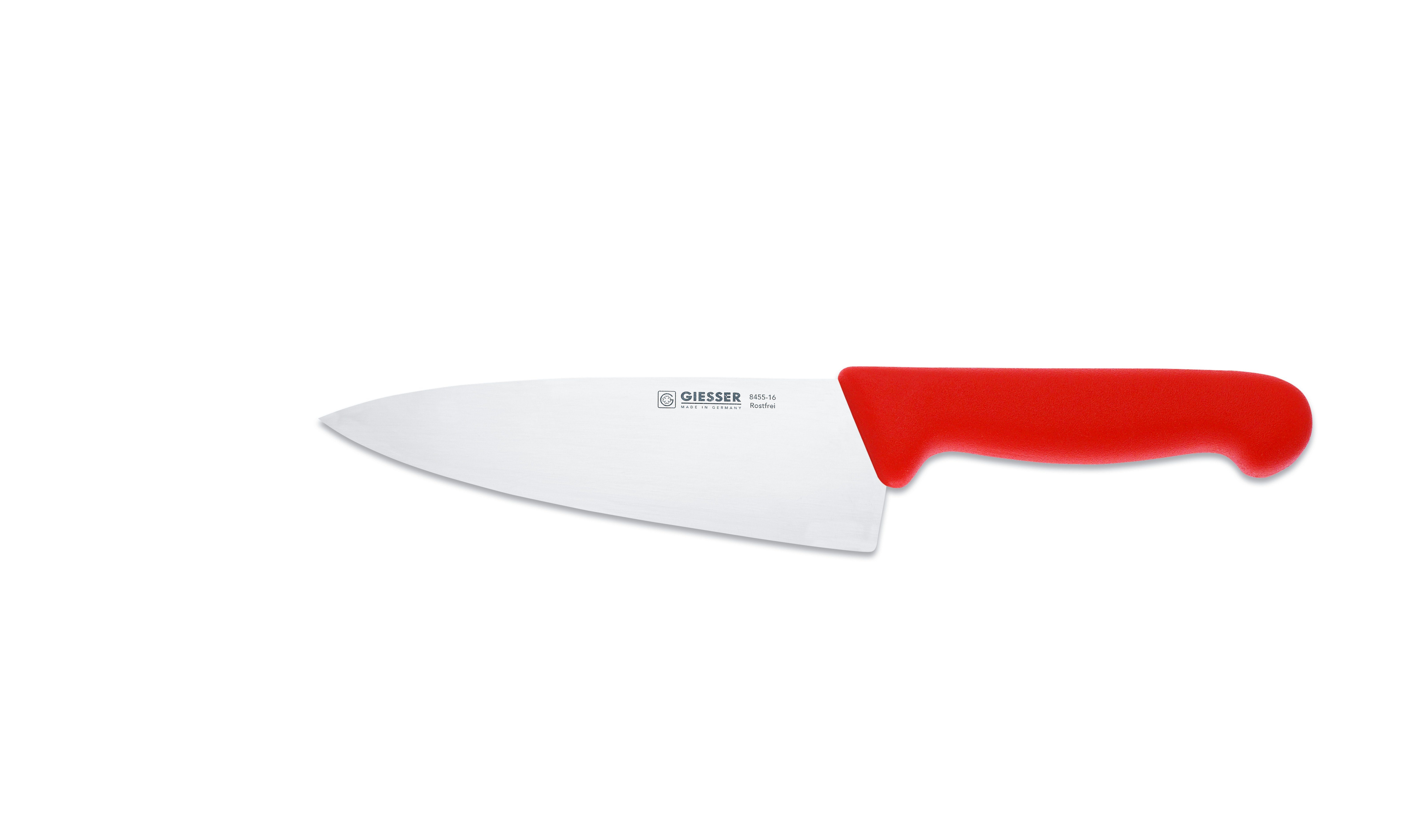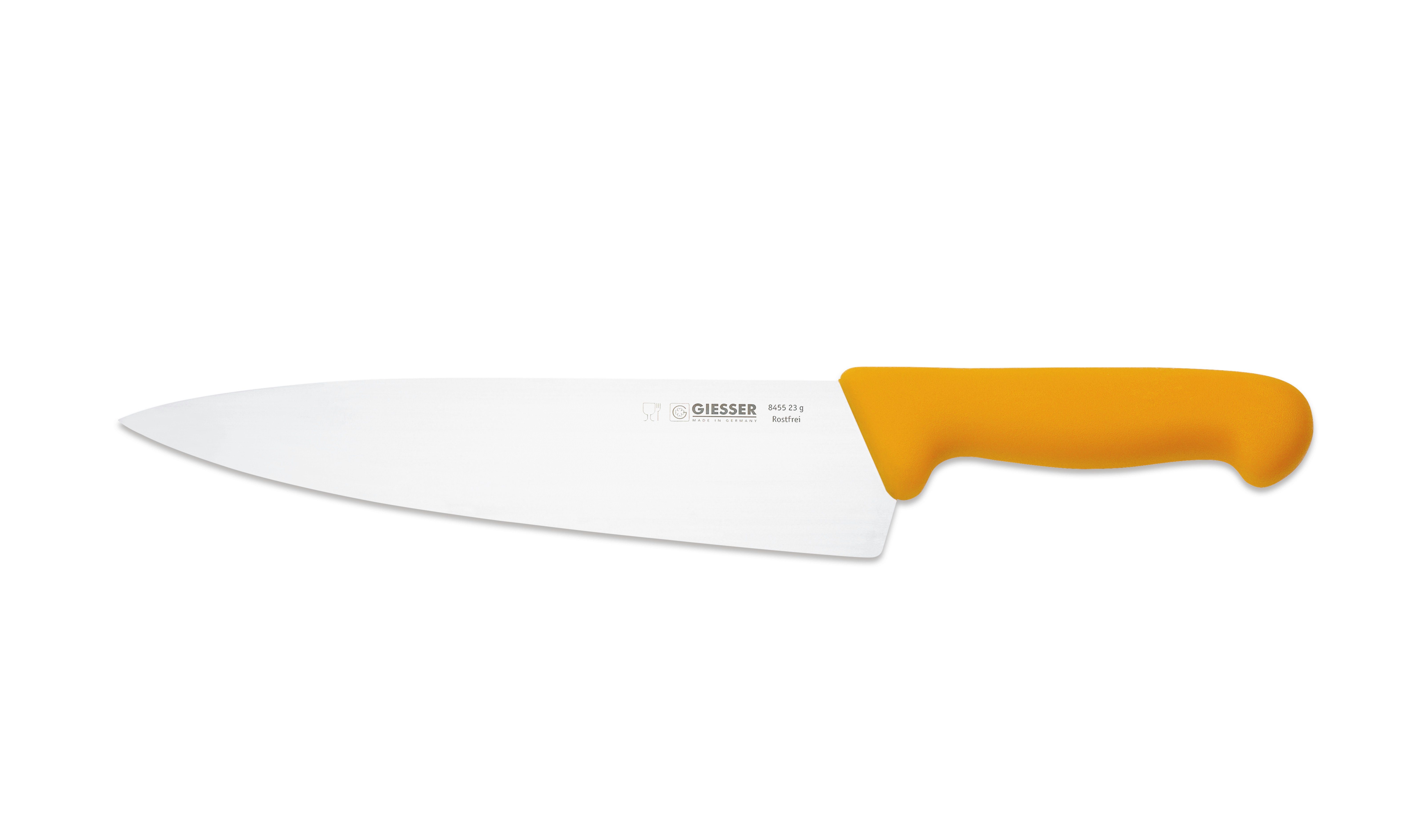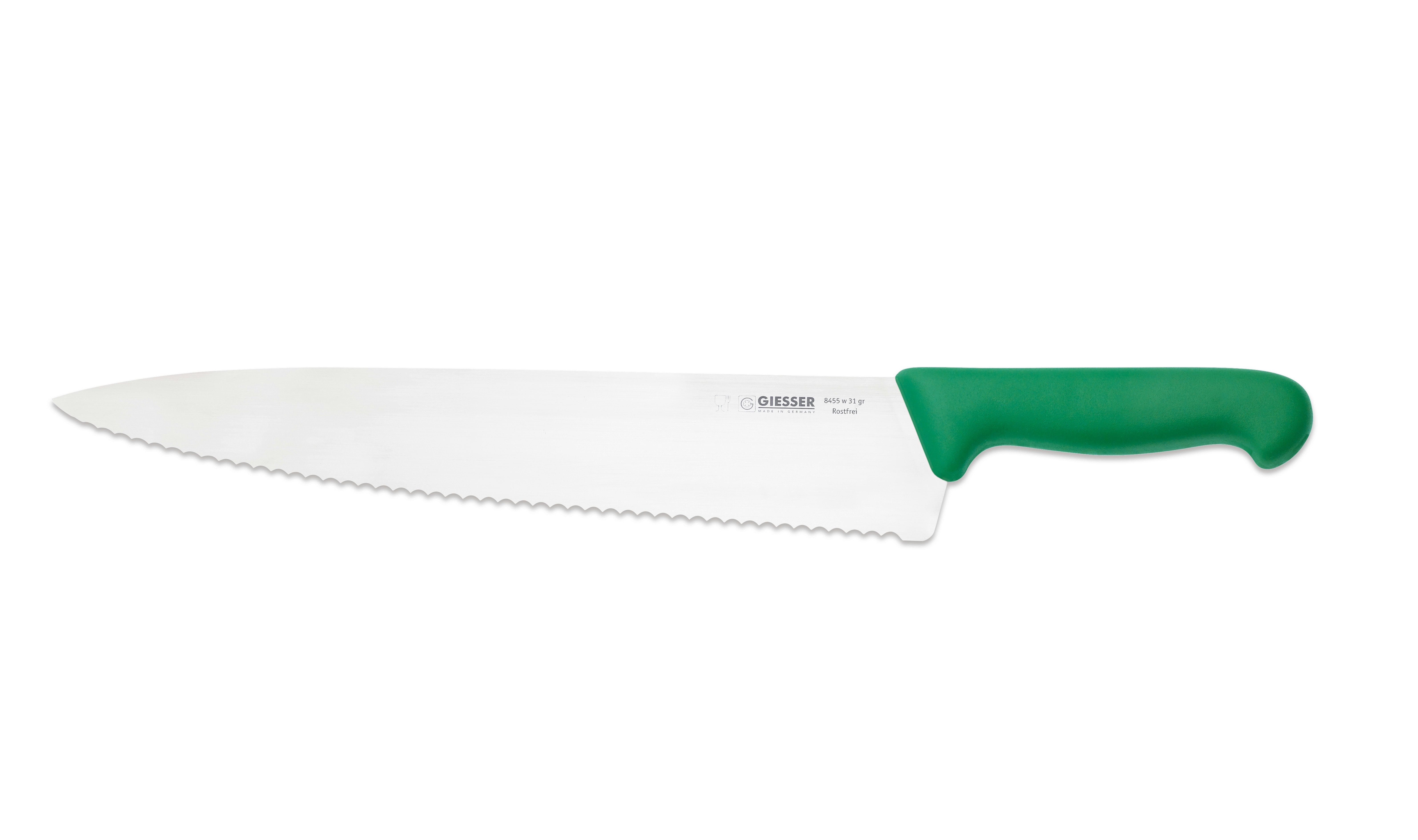 Das Giesser Kochmesser 8455 ist ein hochwertiges Messer der renommierten deutschen Messerschmiede Johannes Giesser Messerfabrik GmbH. Es verfügt über eine scharfe Klinge aus Chrom-Molybdän-Spezialstahl, die durch einen speziellen Schliff besonders effizient schneidet. Mit einer Härte von 55 bis 56 HRC und einer Длина von 16 cm bis 31 cm ist das Messer ideal für viele Küchenarbeiten wie das Schneiden von Obst, Gemüse oder Fleisch. Die schmale, mittelspitze Klingenform und der abgerundete Messerrücken sorgen für maximale Kontrolle und Präzision beim Schneiden. Der ergonomisch geformte und rutschfeste Griff aus TPE-Kunststoff ist in den Farben schwarz, blau, braun, gelb, grün, limette, pink, rot, weiß und halal violett erhältlich und bietet eine hervorragende Balance zwischen Klinge und Griff für ermüdungsfreies Schneiden. Das Kochmesser ist ein hochwertiges Werkzeug für den täglichen Gebrauch in der Küche und hat eine lange Lebensdauer. Zudem ist es Made in Germany und spiegelt die hohe Qualität und jahrzehntelange Erfahrung der Johannes Giesser Messerfabrik GmbH wider.