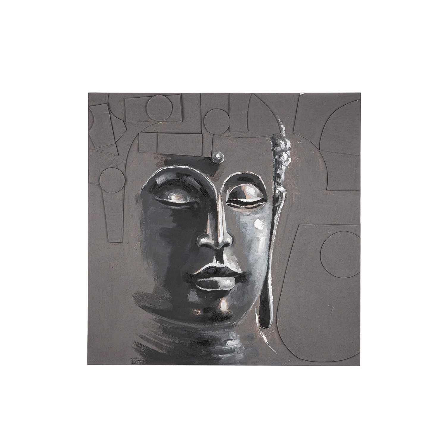 Das Buddha Wandbild Modern ist ein quadratisches Dekorationselement für das Wohnzimmer mit einer beeindruckenden 3D-Optik und handbemalter Oberfläche.
