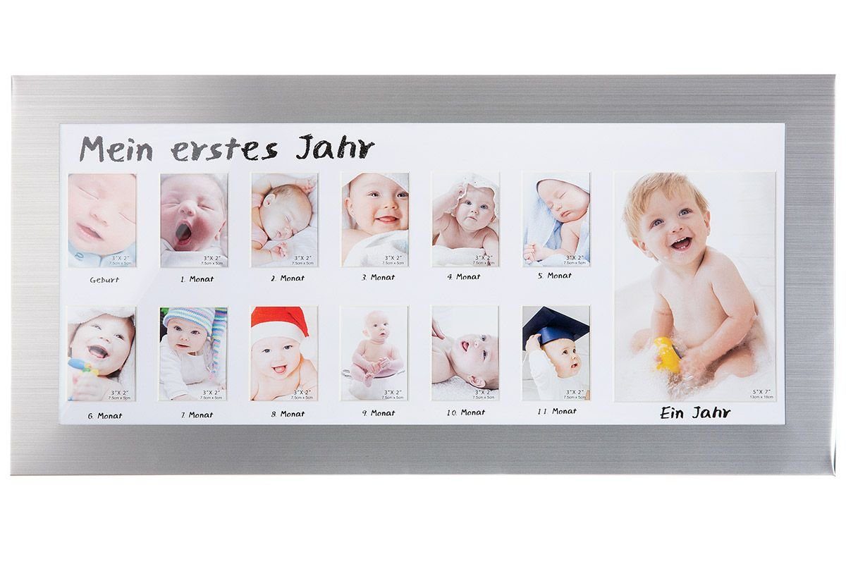 Der Aluminium Fotorahmen "Mein erstes Jahr" ist ein stilvolles und gleichzeitig bedeutungsvolles Dekoelement. In modernem silberfarbenen, gebürsteten Finish gestaltet, bietet er Platz für insgesamt 13 Fotos – ein zentrales Bild im Format 13 x 18 cm, umgeben von 12 kleineren Fotos im Format 7,5 x 5 cm. So können Sie jeden Monat des ersten Lebensjahres Ihres Kindes festhalten und haben eine wundervolle Erinnerung an die rasante Entwicklung, die in diesem Zeitraum stattfindet. Mit den kompakten Maßen von 1 cm Длина, 61 cm Breite und 30,5 cm Höhe ist dieser Rahmen ein prägnanter Hingucker, der in jedem Raum für emotionale Momente sorgt.