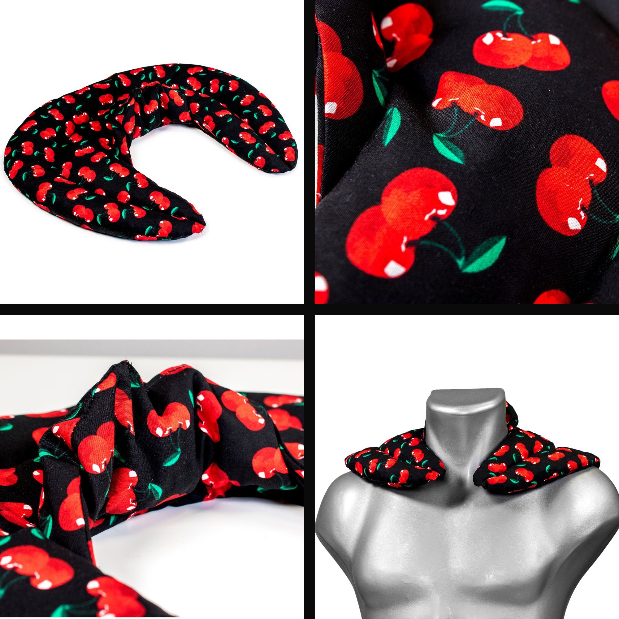 Das Nackenkissen wird mit ca. 850g Kirschkernen befüllt. Dank des geringen Gewichts erzeugt das Kissen wenig Druckbelastung und ist vielseitig einsetzbar. Stoff: 100% Baumwolle.