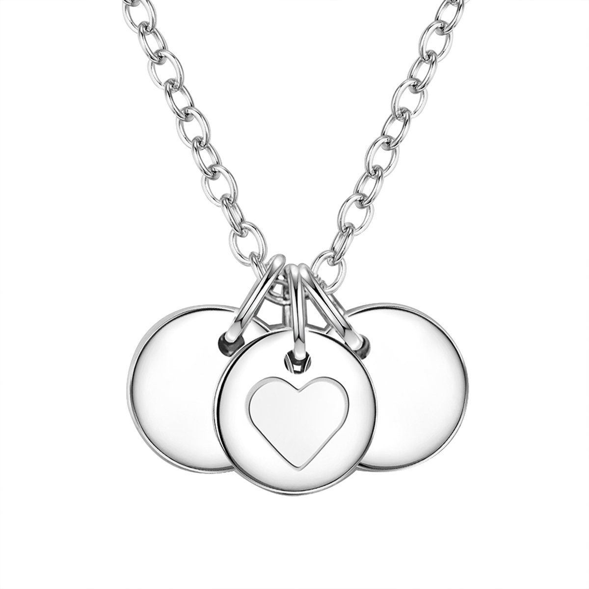 SCHLICHTES DESIGN: Drei runde, hochglanzpolierte Plaketten aus rhodiniertem Sterlingsilber zieren das Dekollete - besonderer Eyecatcher ist ein Coin mit Herzgravur