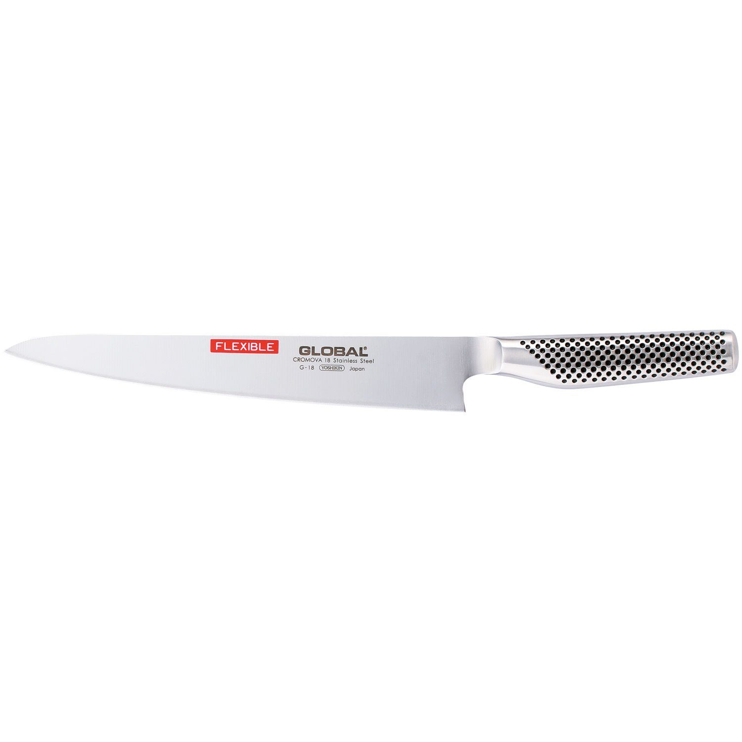 Es gibt viele Arten von Kochmessern, wie zum Beispiel Fleisch-, Brot- und Gemüse-Messer. Für die hohe Kunst des Filetierens jedoch hat Global spezielle Messer entwickelt - flexible Filetiermesser. Das G-18 Global Yoshikin flexibles Filetiermesser mit seiner Klingenlänge von 24 cm ist besonders zum Auslösen von kleineren Fischen (unter 200 Gramm) geeignet. Damit schneiden Sie aus Rotbarben, Felchen usw. ganz leicht wunderbare Filets.