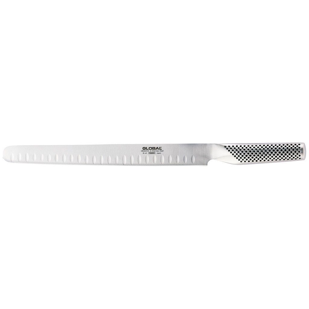 Das G-65 Global Yoshikin Schinken- Lachsmesser hat einen Kullenschliff und eine Klingenlänge von 27 cm. Das G-65 kann sowohl als Lachsmesser als auch als Schinkenmesser oder als Fleischmesser genutzt werden. Das Messer kann auf Grund seiner Размер auch größere Lachse oder große Schinken gut schneiden. Im Unterschied zum G-69 hat das G-65 einen Kullenschliff. Dies ermöglicht eine Art Antihaft-Schicht. Mit Kullenschliff beleibt weniger am Kochmesser kleben.