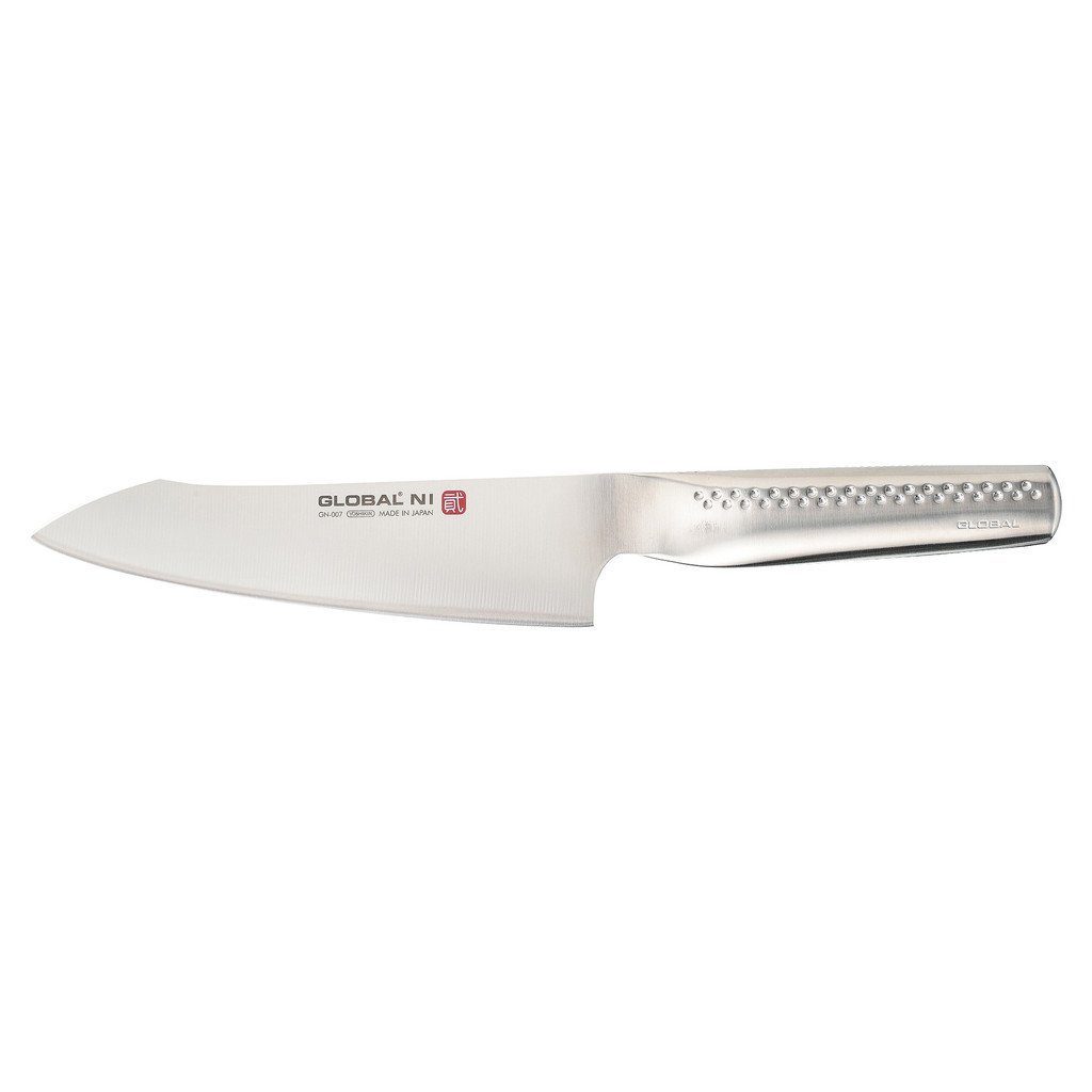 Das Global NI Santokumesser 18 cm GN-007 überzeugt durch höchste japanische Handwerkskunst und modernste Применитьungstechnologie. Die 18 cm Klinge aus Molybdän-Edelstahl (X 50 Cr MoV 15) garantiert außergewöhnliche Schärfe, maximale Schnitthaltigkeit und hervorragende Korrosionsbeständigkeit. Die glatte oder flexible Klinge gleitet mühelos durch Fleisch, Gemüse und Obst und sorgt für präzise, gleichmäßige Schnitte.