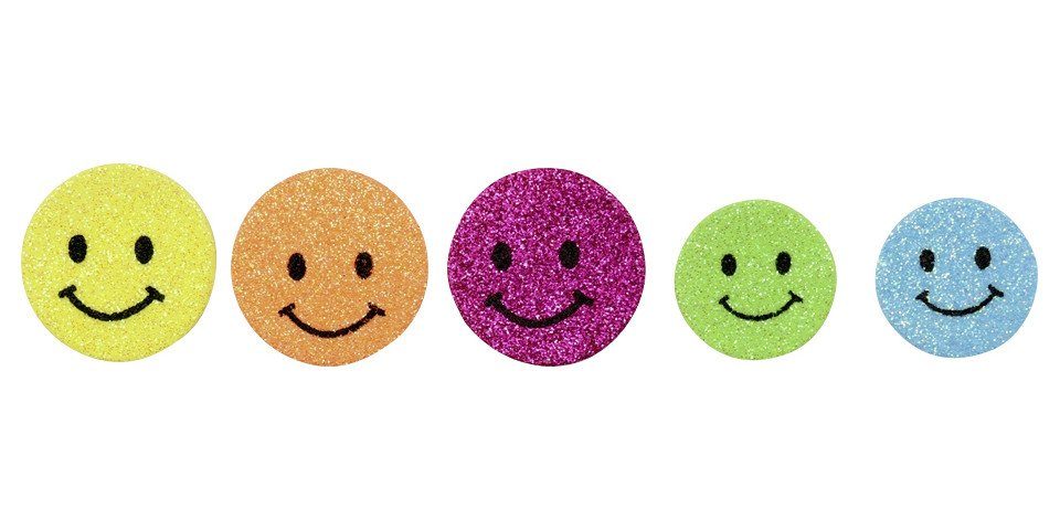 Selbstklebende Moosgummi-Sticker mit witzigen Smiley-Motiven und Glitzer-Effekt. Perfekt geeignet für die kreative Kartengestaltung, Scrapbooking, zum Verzieren von Geschenken, Pinnwänden und als Dekoration für Kinderzimmer.