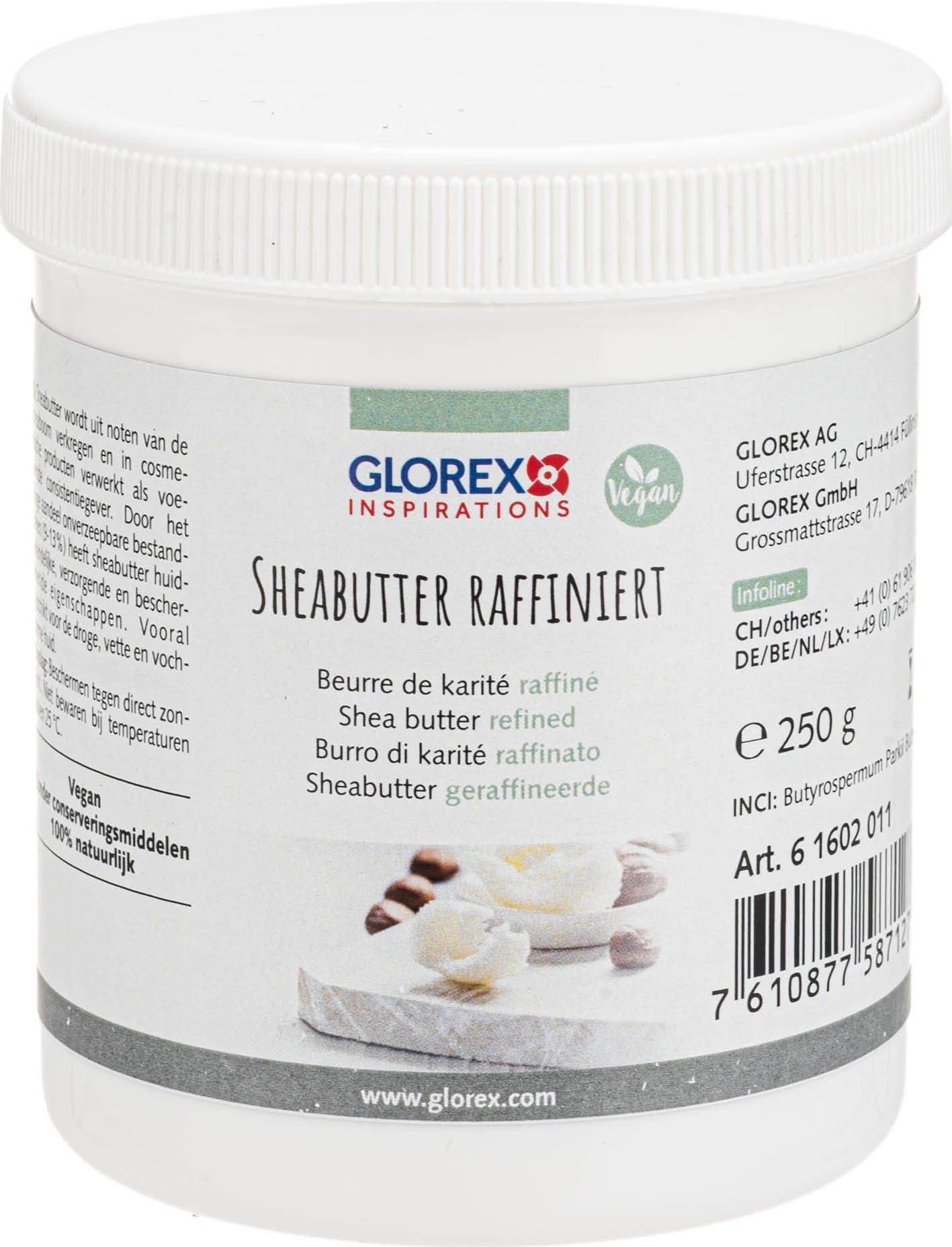Sheabutter, raffiniert für die reichhaltige Körperpflege. Enthält Ölsäuren und unter anderem Beta Carotin und Vitamin E. Besonders pflegend und ideal für weiche und geschmeidige Haut. Lässt sich als Pflege für den gesamten Körper verwenden sowie als Lippenbalsam und Haarkur. Die natürliche Kosmetik kann mit Mandel-, Jojoba- oder Kokosöl nach Belieben angereichert werden. Ebenso lassen sich ätherische Öle und Parfümöle einmischen. Für individuelle, hochwertige Kosmetik. Abgefüllt in eine Dose und mit Etikett und Schleifenband versehen wird eine prima Aufmerksamkeit daraus.