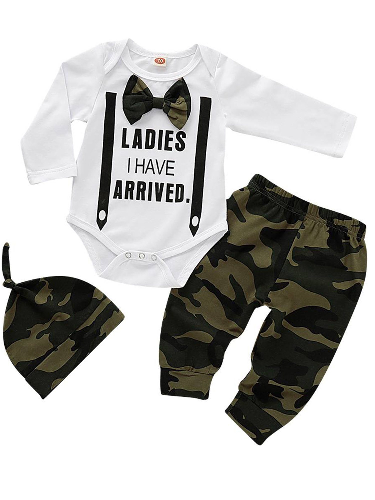 Einzigartiges Design: klassischer Buchstabendruck, mit Fliege-Dekoration, klassische Hose und Hut im Tarnstil, machen Sie Ihren Jungen hübsch.