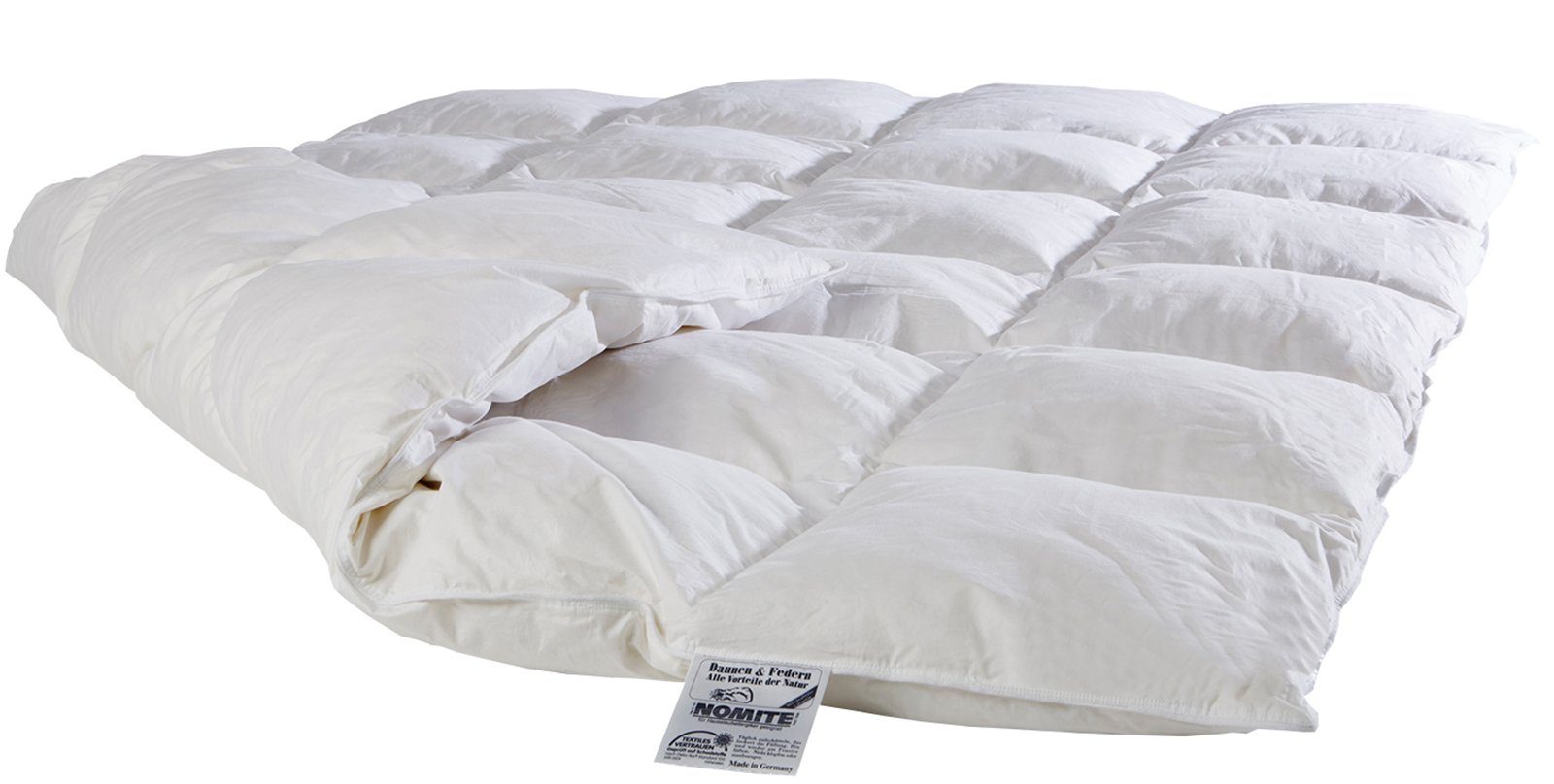 Top-Features | DOWNPASS - Der DOWNPASS ist ein Tierschutz- und Rückverfolgbarkeitsstandard für Daunen und Federn. DOWNPASS stellt sicher, dass ausschließlich Daunen und Federn eingesetzt werden, die nicht von lebenden Tieren oder aus der Stopfleberproduktion gewonnen wurden. DOWNPASS-Produkte unterliegen strengen Qualitätskontrollen durch anerkannte Prüfinstitute. (Prüfnummer: CAL-16-0426) NOMITE - Das NOMITE-Zeichen signalisiert Ihnen, dass es sich um ein Produkt handelt, das für Hausstaubmilbenallergiker geeignet ist. Denn federn- und daunengefüllte Bettwaren sind mit ihren für den Menschen so günstigen Wärme- und Klimaverhältnissen (schneller Wärmeaufbau während des Schlafens, schneller Feuchtigkeitsabbau beim Lüften) für die feuchtigkeitsabhängigen Milben eine sehr ungünstige Umgebung. |