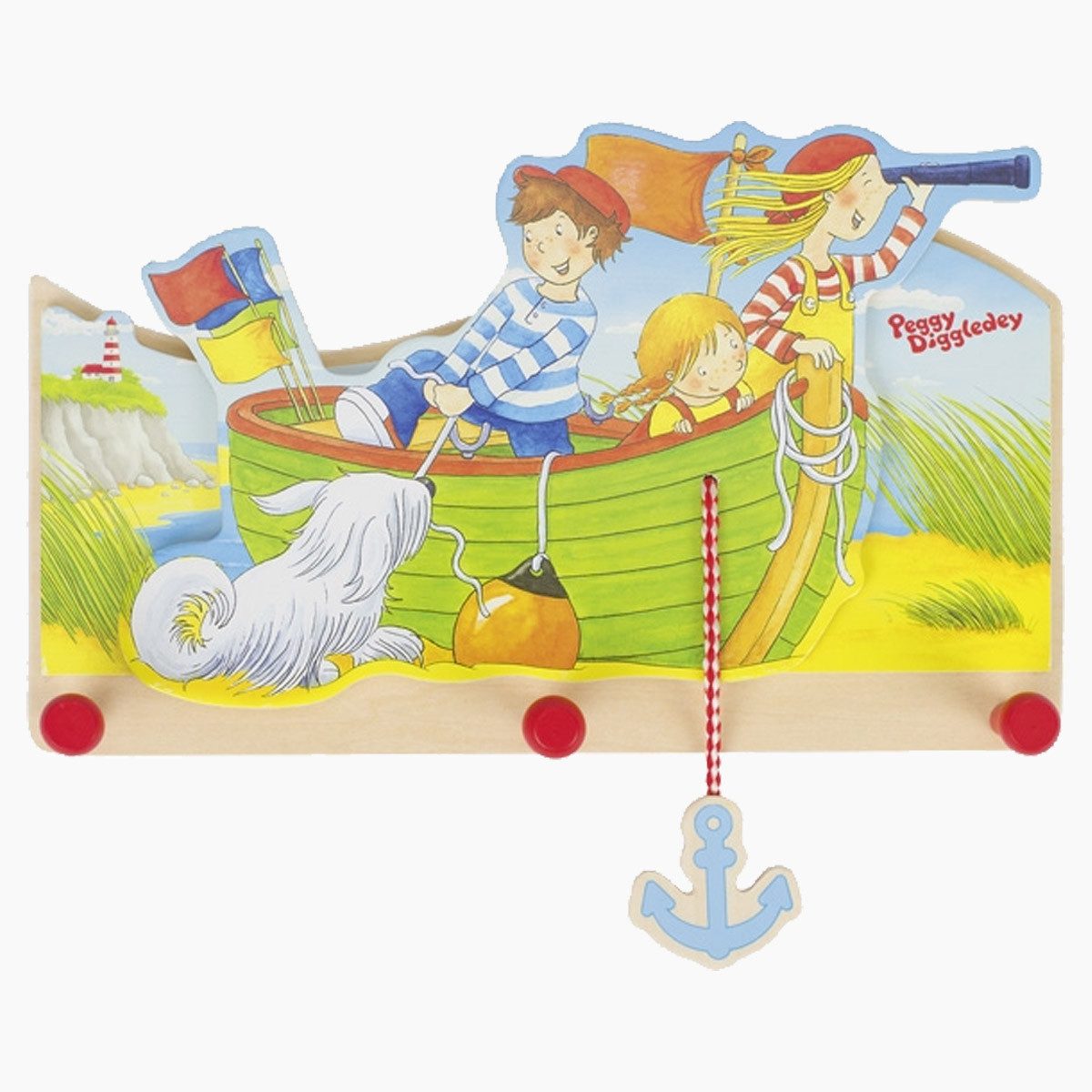 Die Garderobe Peggy Diggledey vereint funktionale Ordnungsliebe mit liebevollem Design. Mit ihren drei stabilen Holzhaken und einem originellen Anker als zusätzlicher Aufhängemöglichkeit ist sie die perfekte Lösung für Jacken, Mützen, Taschen und mehr. Gleichzeitig verwandelt sie jede Wand in eine kleine Abenteuerwelt – inspiriert von der bekannten Kinderfigur Peggy Diggledey.
