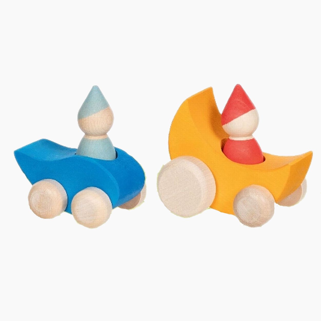 Tröpfchen, mit seinem tropfenförmigen Fahrzeug, bringt Wasserwelten in die Kinderfantasie. Die Figur lächelt freundlich und lädt zu Geschichten rund um Natur und Regen ein. Mondfahrt hingegen steht für Weite und Abenteuer: Das Astronautenfahrzeug ist bereit für Missionen ins All. Beide Charaktere regen zum Nachspielen kleiner Alltags- oder Fantasiegeschichten an.