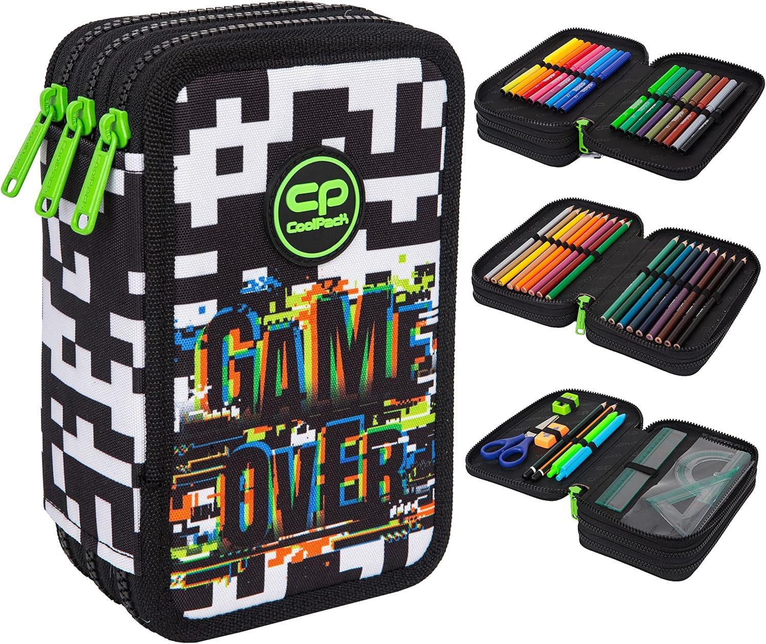 Diese Schlamperetui lässt sich durch zwei Reißverschlüsse öffnen und aufklappen, sodass insgesamt 3 Fächer zur Aufbewahrung von Buntstiften, Bleistiften, Füllfederhalter, Lineal, Anspitzer und Radiergummi zur Verfügung stehen.