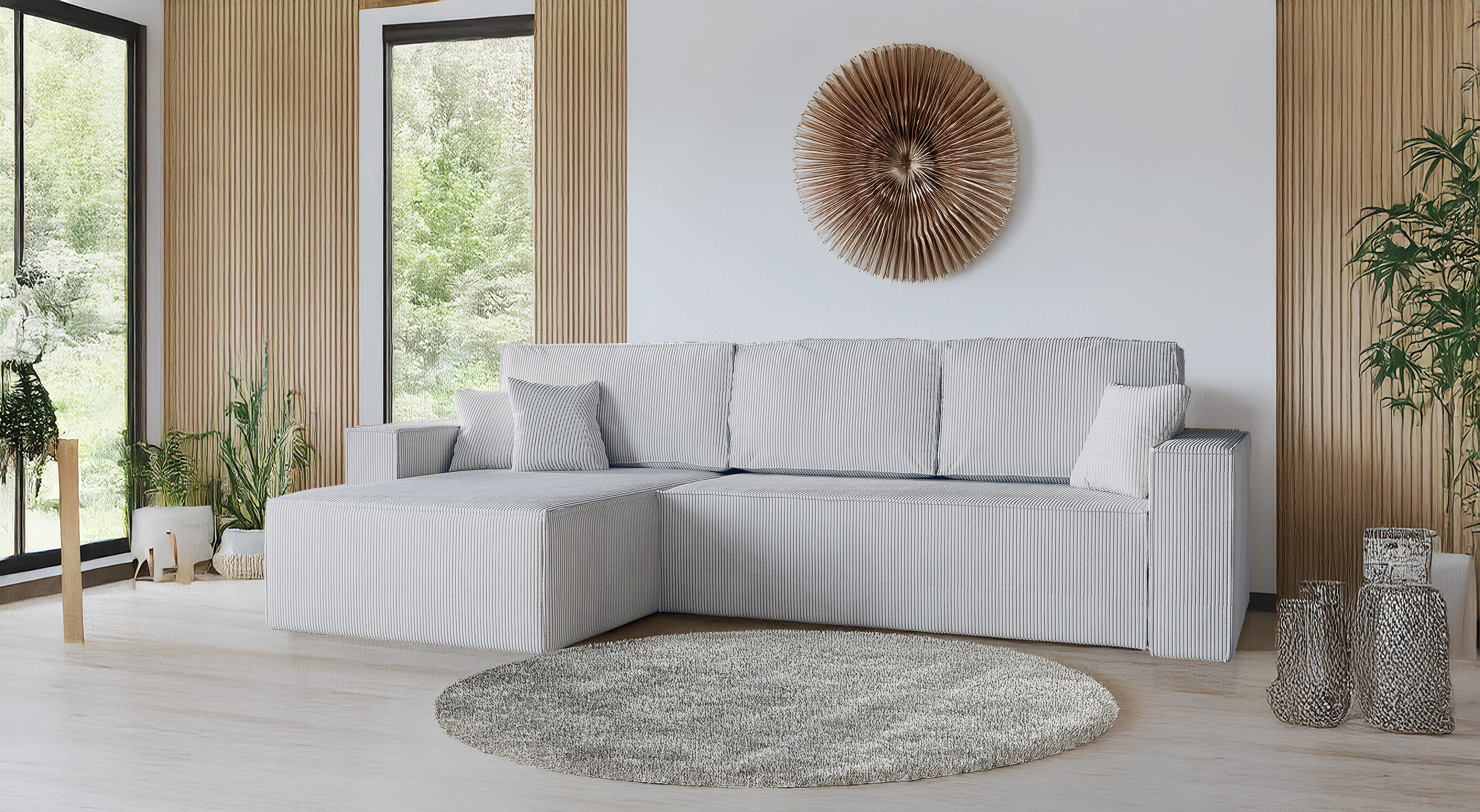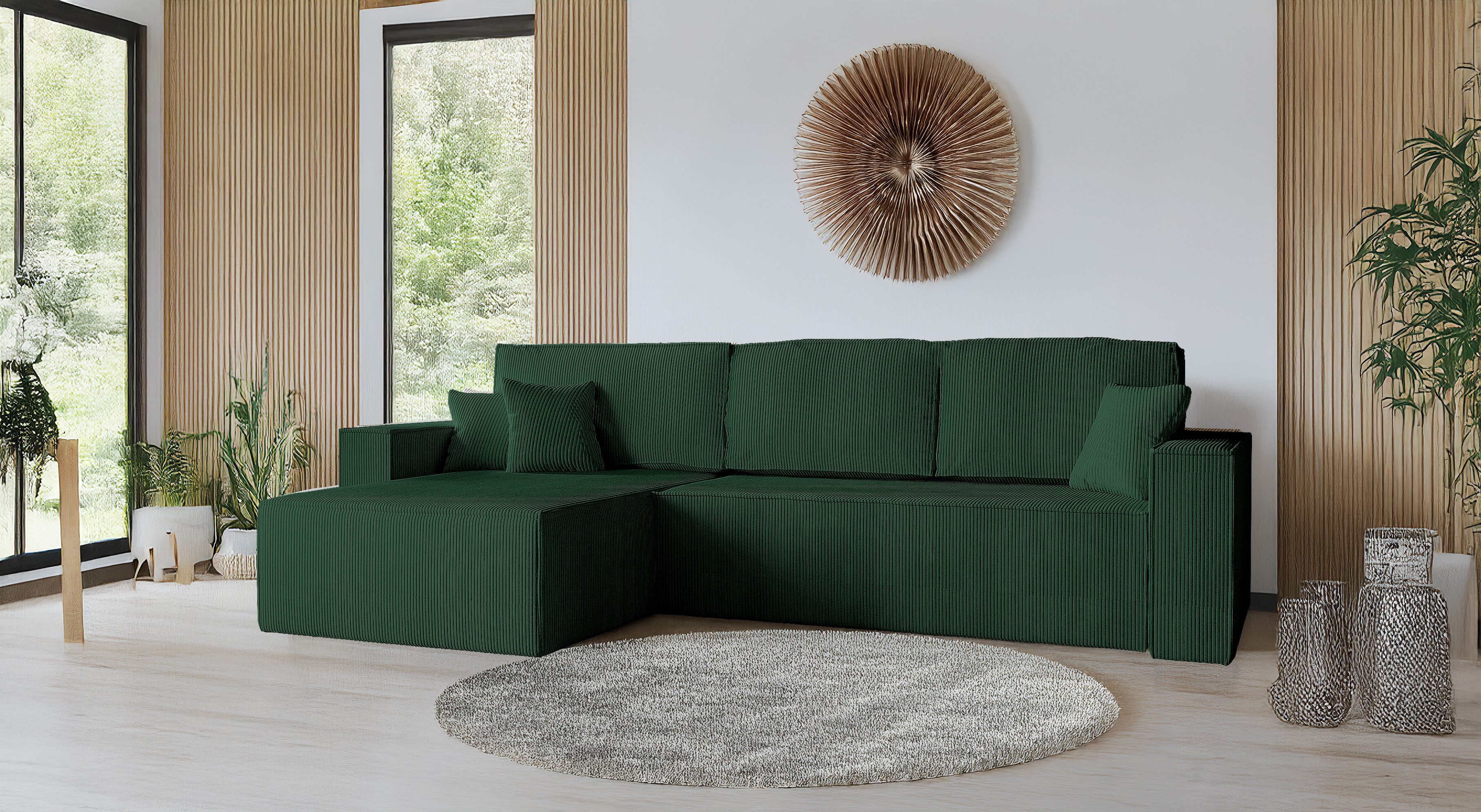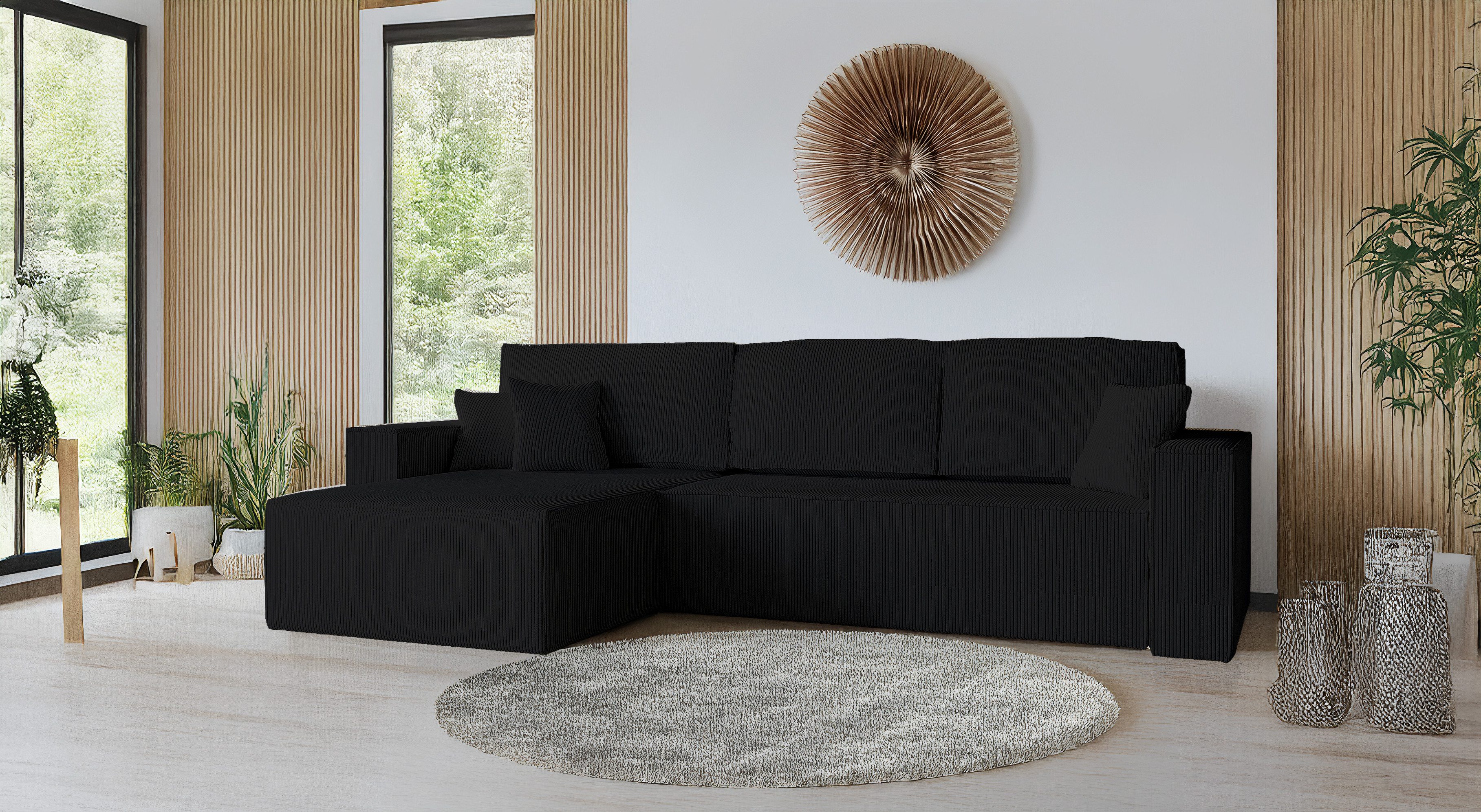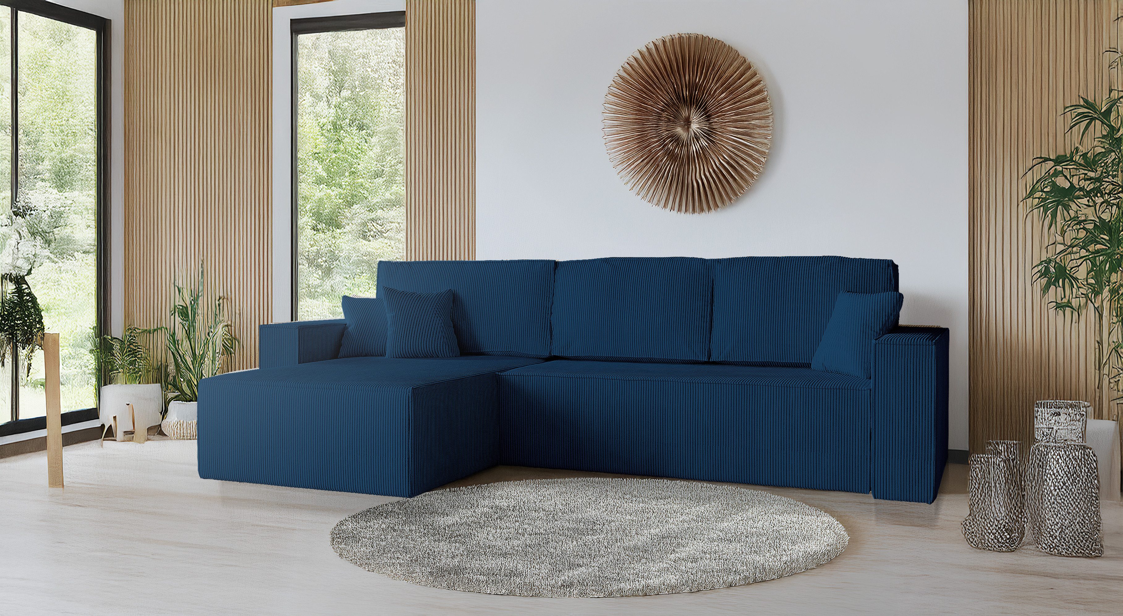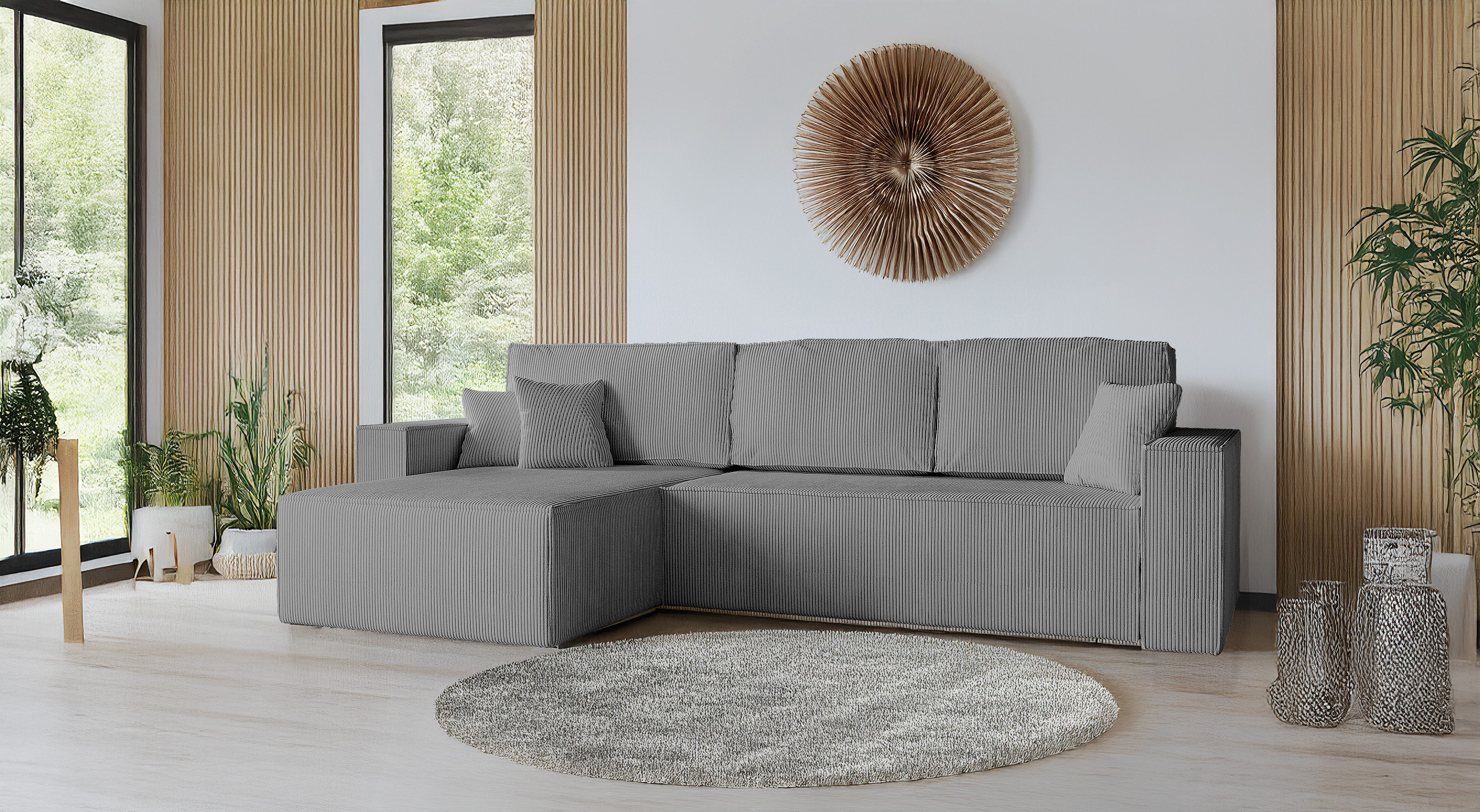 Dieses moderne Ecksofa mit Schlaffunktion verbindet stilvolles Design mit hoher Funktionalität und außergewöhnlichem Komfort. Dank des praktischen Bettkastens und des ausziehbaren Delfin-Mechanismus lässt sich das Schlafsofa mühelos in eine großzügige Liegefläche von 230 x 147 cm verwandeln – perfekt für Gäste oder entspanntes Relaxen.