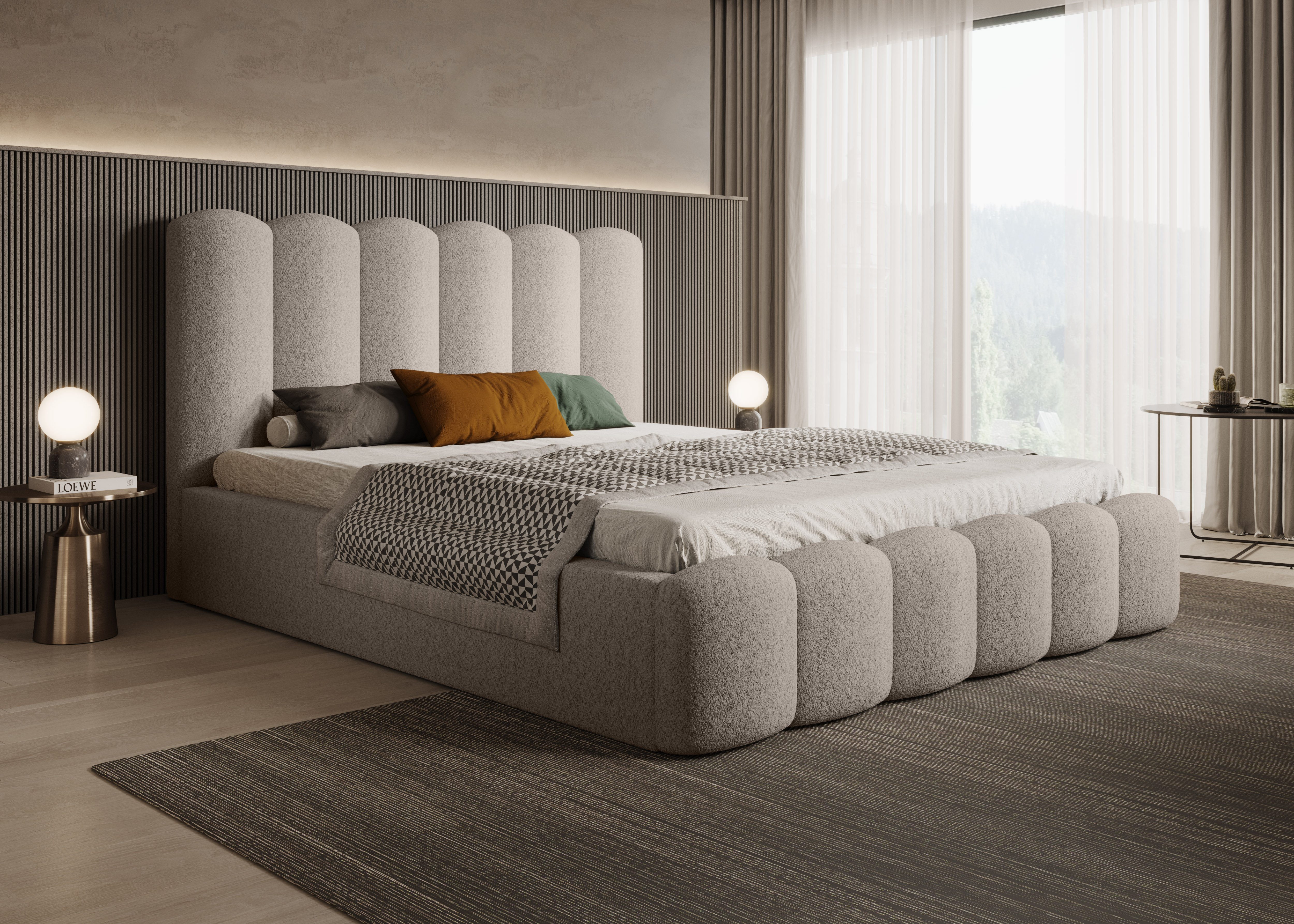 Das Polsterbett LOFT von GOLDSTOFF verbindet modernes Design mit durchdachter Funktionalität – ideal für stilbewusste Schlafzimmer. Das gepolsterte hohe Kopfteil (114 cm) ist nicht nur ein ästhetischer Blickfang mit halbkreisförmigen Designelementen, sondern auch angenehm zum Anlehnen bei entspannten Abendstunden.