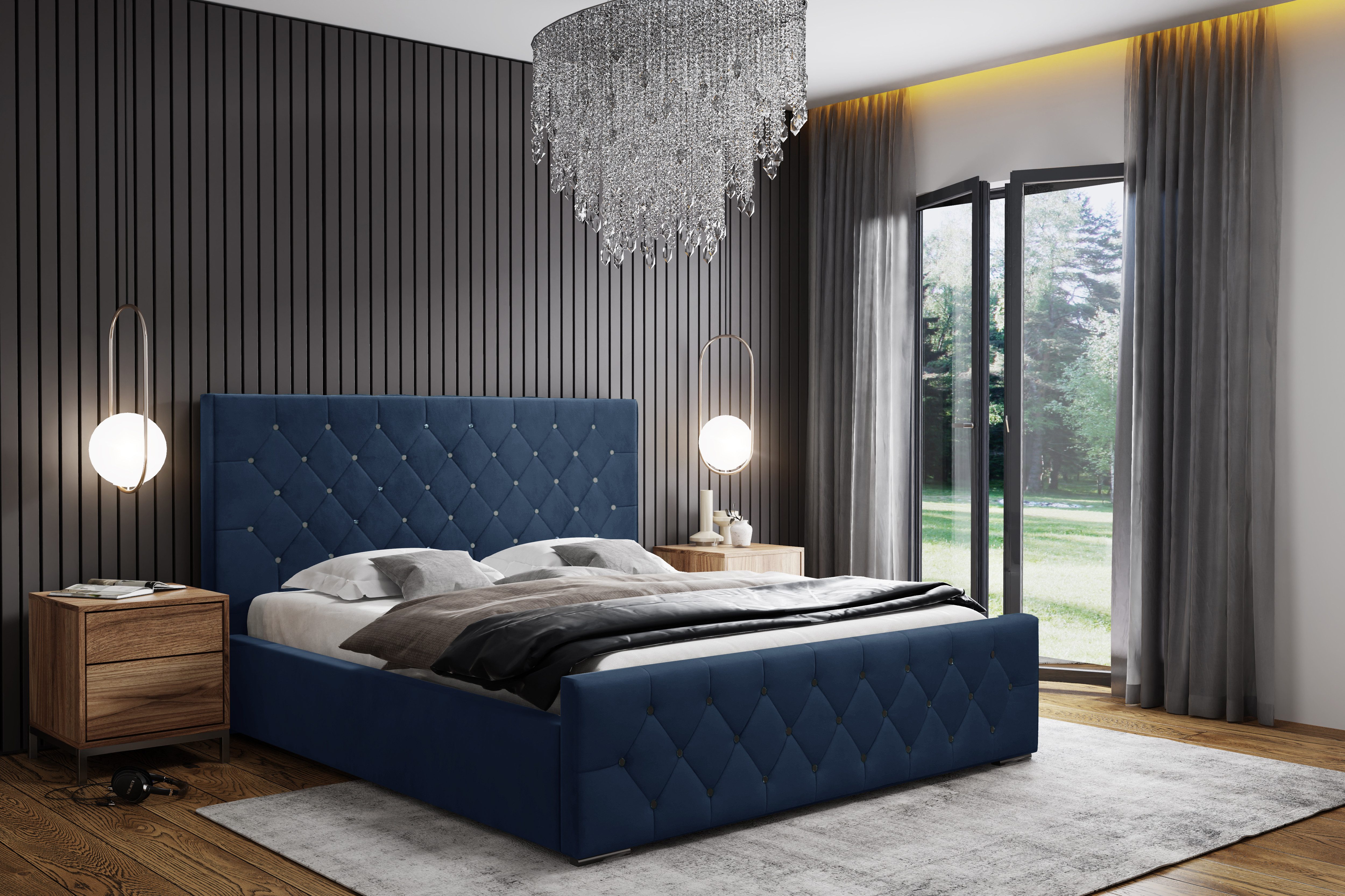 Design trifft Funktionalität: Das Bett beeindruckt mit einem extra hohen Kopfteil (110 cm), das mit aufwendig gesteppter Rautenstruktur und dekorativen Kristallen versehen ist – ein echtes Highlight für stilvolle Schlafräume. Die klassische Linienführung wird durch ein modernes Erscheinungsbild ergänzt und fügt sich nahtlos in verschiedene Einrichtungsstile ein.