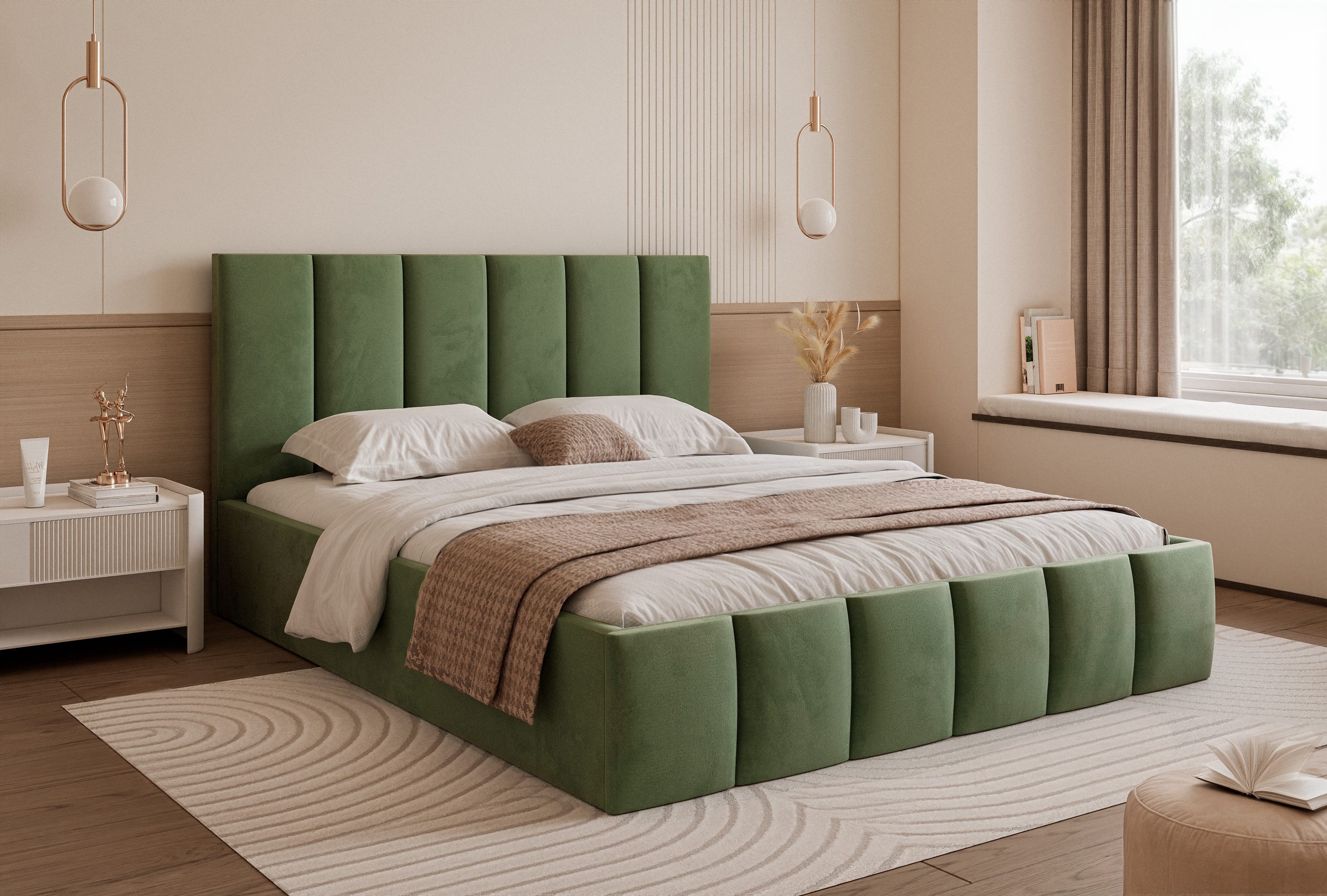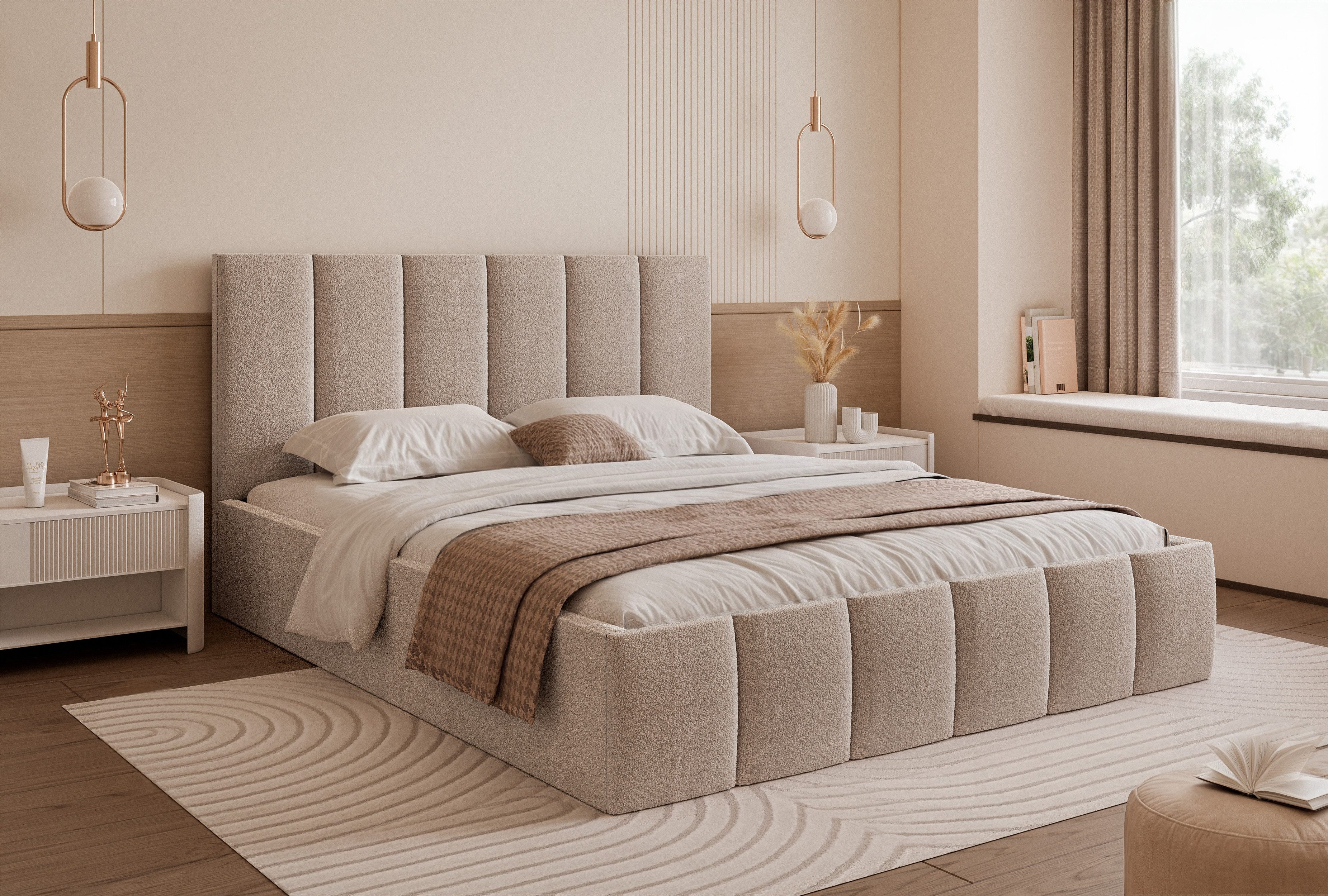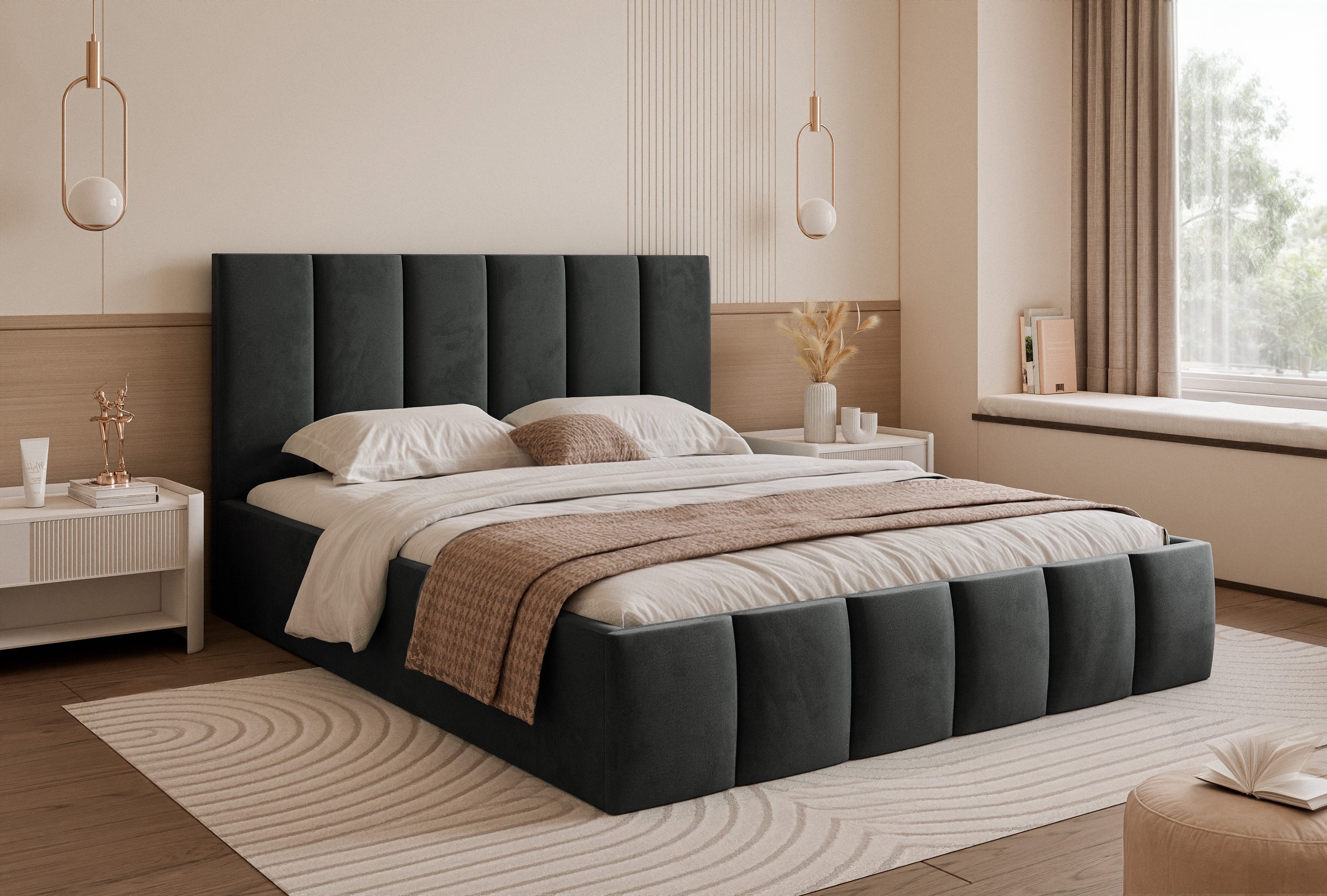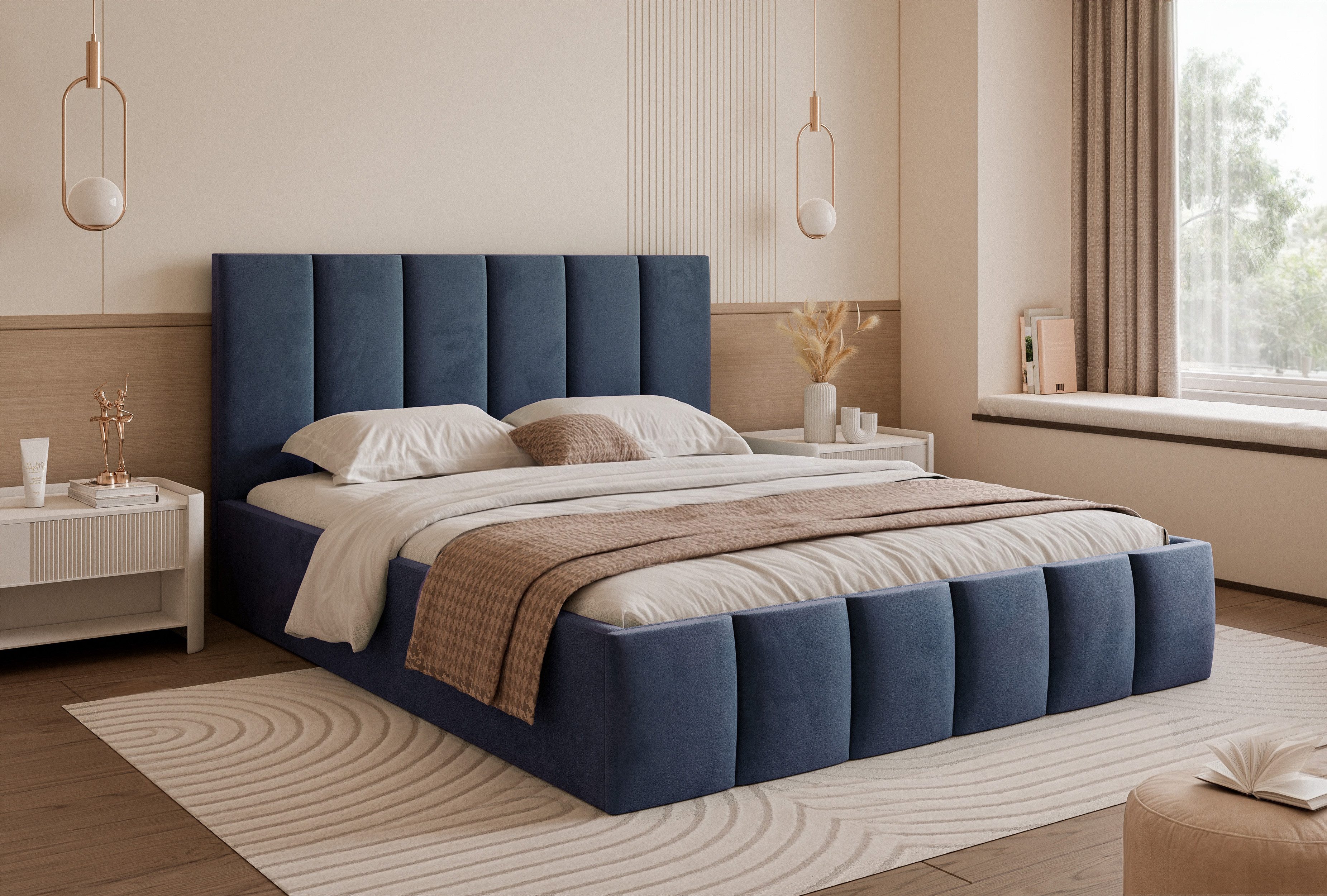 Das gepolsterte Kopfteil ist in zwei Höhen (90 cm oder 110 cm) erhältlich und bietet optimalen Komfort beim Lesen, Fernsehen oder Entspannen. Die weiche 3 cm-Schaumstoffpolsterung sorgt für ein angenehmes Anlehnen, während die vertikale Steppung das Design optisch aufwertet. Dieses Detail macht das Bett zu einem echten Blickfang und unterstreicht den luxuriösen Charakter des Schlafbereichs.