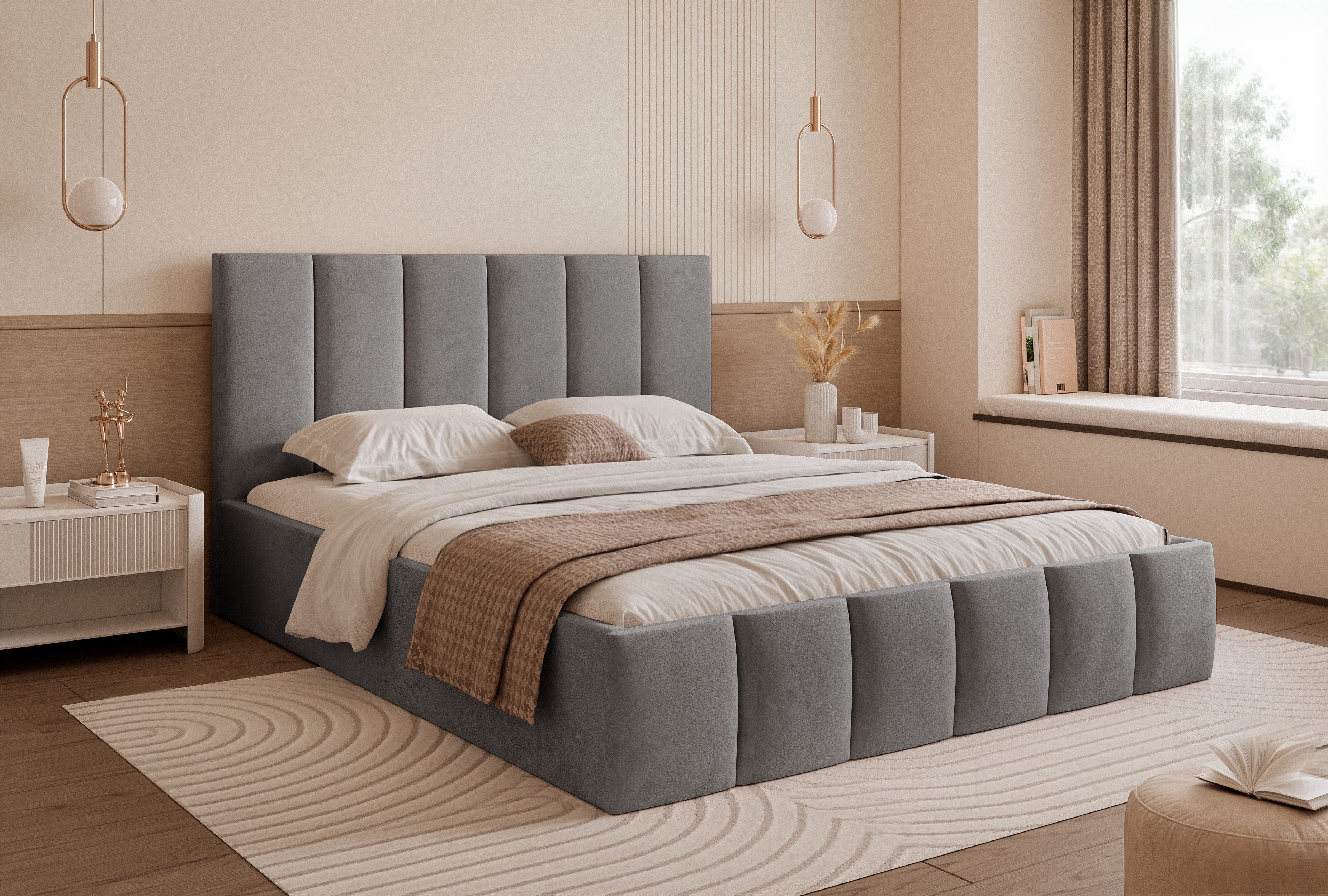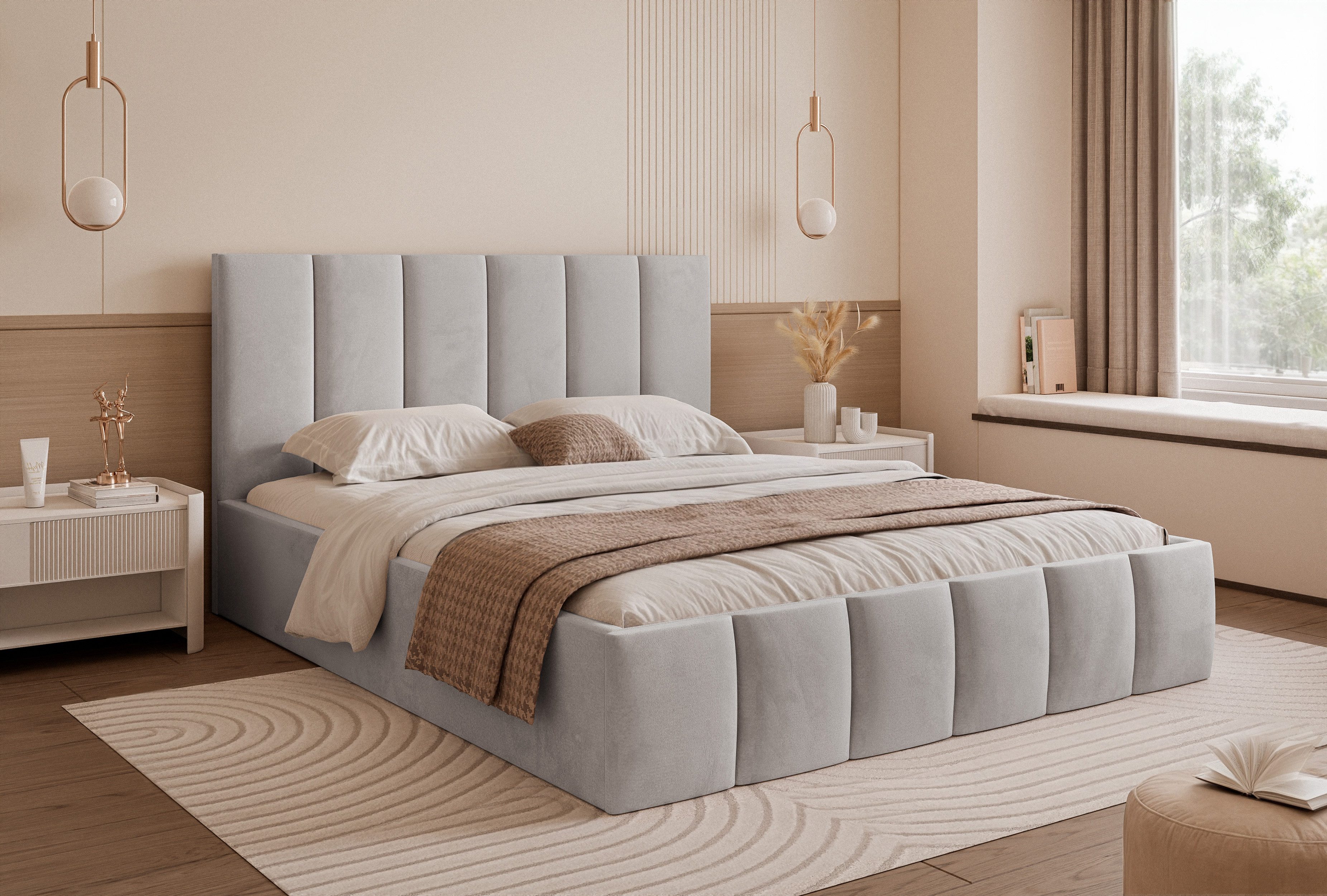 Dieses hochwertige Designbett vereint modernes Erscheinungsbild, klare Linien und luxuriösen Komfort. Das minimalistische Design mit vertikalen Steppungen am Kopfteil und an der Vorderseite verleiht dem Bett eine zeitgemäße und elegante Ausstrahlung. Dank seiner harmonischen Form fügt es sich perfekt in verschiedene Einrichtungsstile ein – von modern über skandinavisch bis klassisch.
