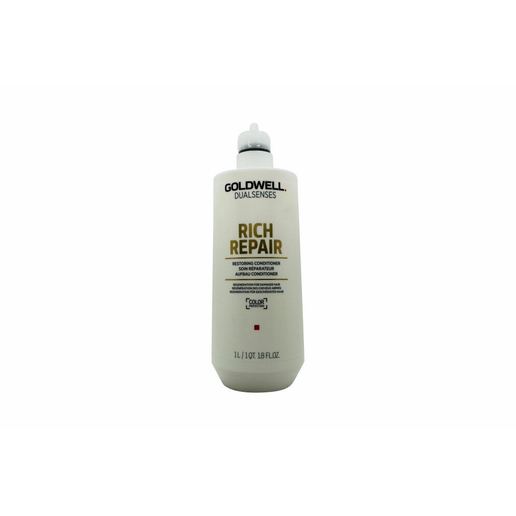 Der Goldwell Dualsenses Rich Repair Restoring Conditioner 1000 ml repariert mit der cremigen Spülung trockenes und strapaziertes Haar und verleiht ihm einen seidigen Glanz und neue Kraft. Sie versorgt das Haar mit wichtigen Nährstoffen, intensiver Feuchtigkeit und kräftigt es für neue Energie. Zudem wird es leichter kämmbar. Ebenso ist die Haarfarbe vor dem Verblassen geschützt. Das Haar wird nach der Reinigung von der Wurzel bis in die Spitzen repariert und erhält eine seidige Geschmeidigkeit sowie einen strahlenden Glanz.