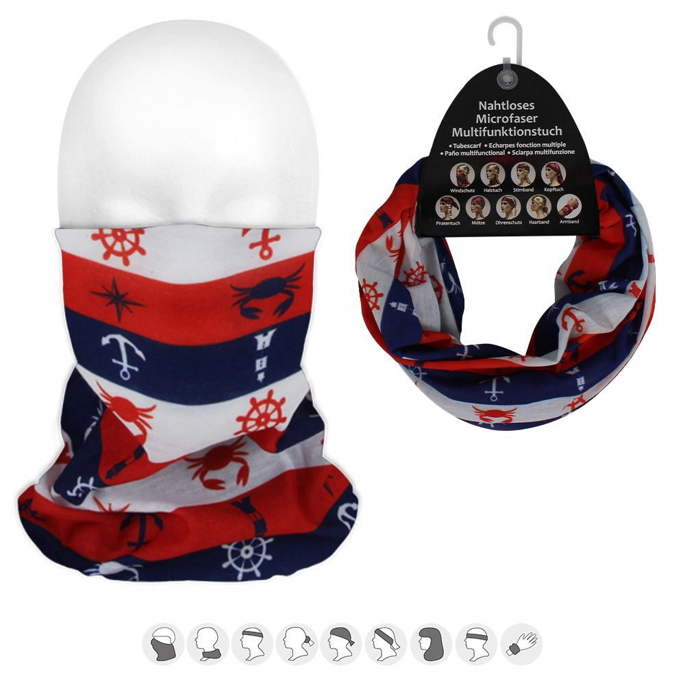 Dieses nahtlose Multifunktionstuch mit auffälligem maritimen Streifenmuster in Rot, Weiß und Blau bringt frischen Wind in dein Outfit! Mit Motiven wie Anker, Steuerrad, Kompassrose und Krebs ist es ein echter Hingucker – perfekt für alle, die das Meer lieben. Dank seines weichen Mikrofaser-Materials bietet es höchsten Tragekomfort bei jeder Aktivität. Egal ob als Loop, Schal, Stirnband oder Gesichtsschutz – dieses Tuch ist ein praktischer Allrounder für unterwegs. Ob für Strandspaziergänge, Radtouren oder Festivals – dieses Tuch kombiniert maritimen Stil mit praktischer Funktionalität.