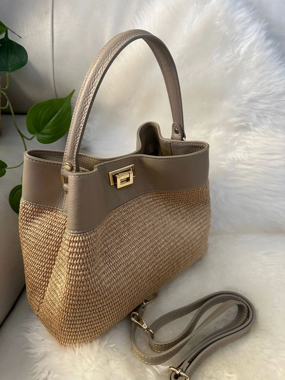 Feine Kombination aus echtem Dollarnappaleder und natürlichem Raffia