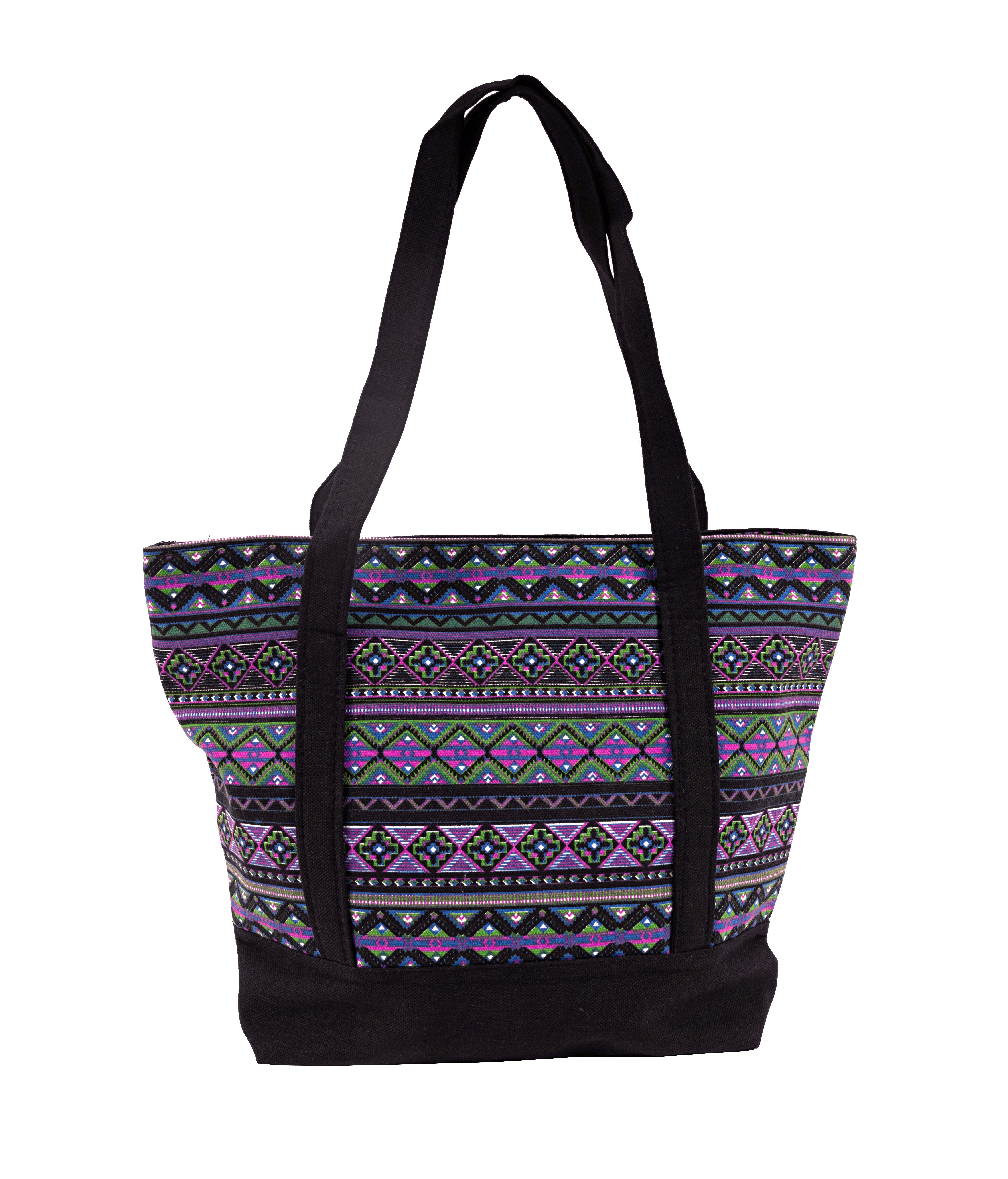 Die Ethno Canvas Schultertasche vereint funktionales Design mit einem farbenfrohen Tribal-Muster. Gefertigt aus 100% robuster Canvas-Baumwolle und ausgestattet mit einem verstärkten schwarzen Boden, ist sie nicht nur optisch ein Hingucker, sondern auch besonders langlebig. Das geräumige Hauptfach mit Reißverschluss und Polyesterfutter bietet genügend Platz für Einkäufe, Unterlagen oder Reiseutensilien. Ein zusätzliches Innenfach mit Reißverschluss sorgt für die sichere Aufbewahrung kleiner Wertgegenstände. Mit einer Размер von 40,6 x 33 x 14 cm und komfortablen Tragegriffen (Fallhöhe 28 cm) ist die Tasche ideal für Alltag, Freizeit und Reisen geeignet. Dank der verschiedenen Tribal-Designs ist jede Tasche ein individuelles Unikat, das zu deinem Outfit passt – ob casual mit Jeans oder sommerlich mit Kleidern.